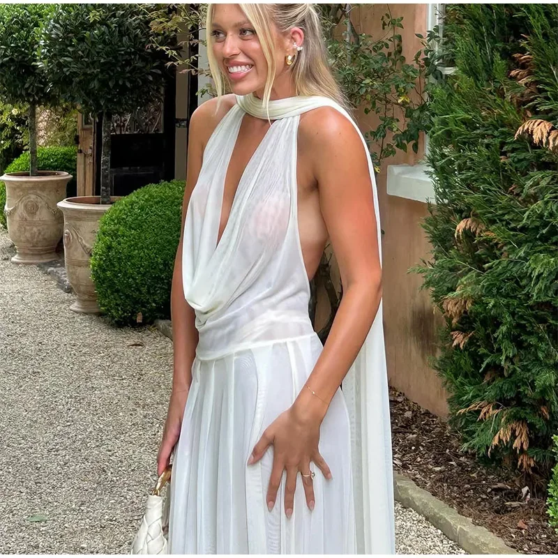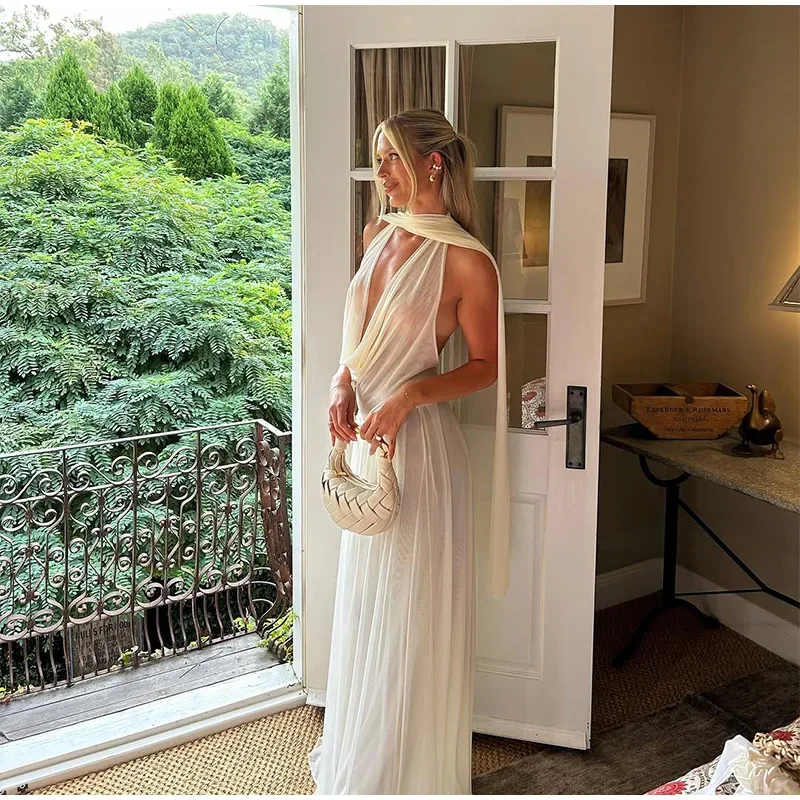 Sexy See Through Deep V Neck White Maxi Dress Elegant Splicing Pleated Mesh Halter Scarf Slim Robes Lady Party Evening Gown