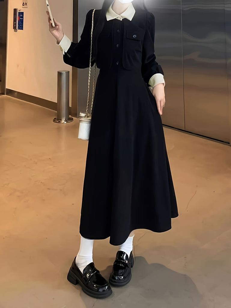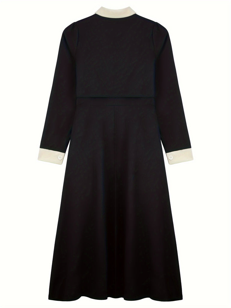 Elegant Black Midi Dress with Button Detail - Long Sleeve, Collared, Non-Stretch Viscose - Perfect for Spring & Fall, Machine Washable, for Autumn, Spring