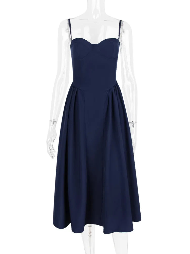 Spaghetti Strap Sleeveless A-line Midi Dress For Women Summer New Backless Pleated Slipdress Ladies Fashion Loose Dress