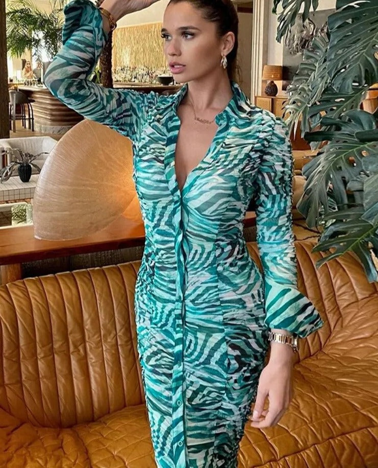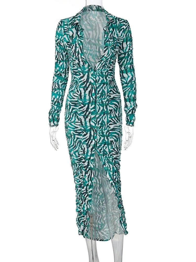 Women Elegant Long Sleeve Printed Bodycon Streetwear Green Midi Dress Autumn Clothes Wholesale Items For Business