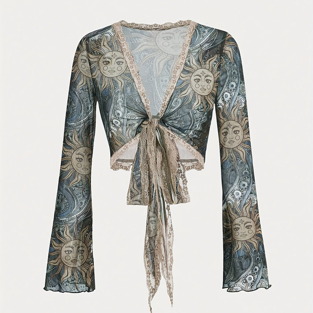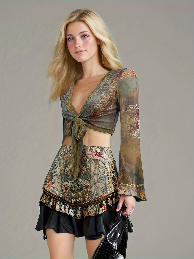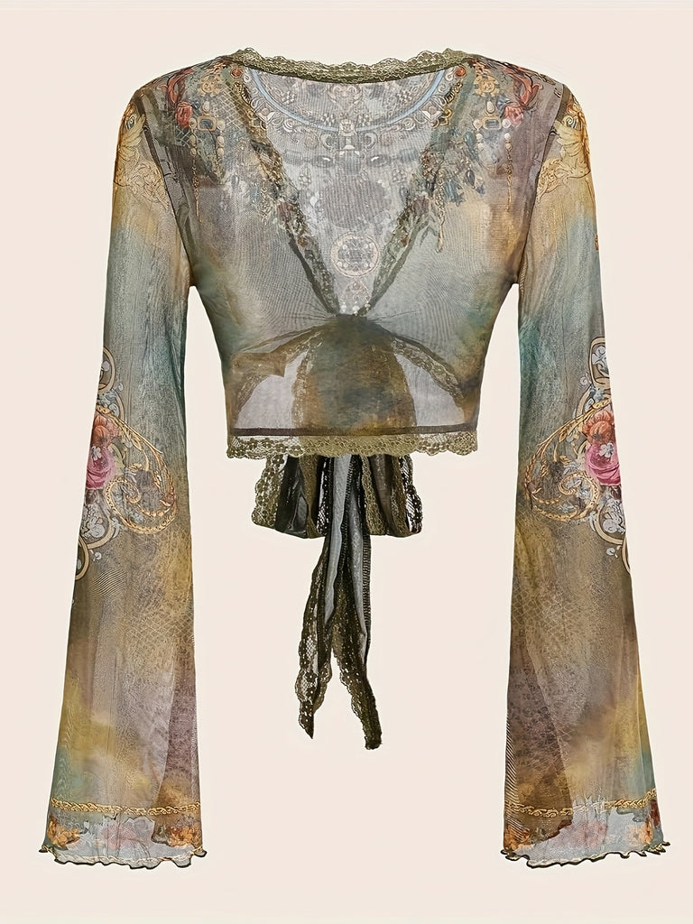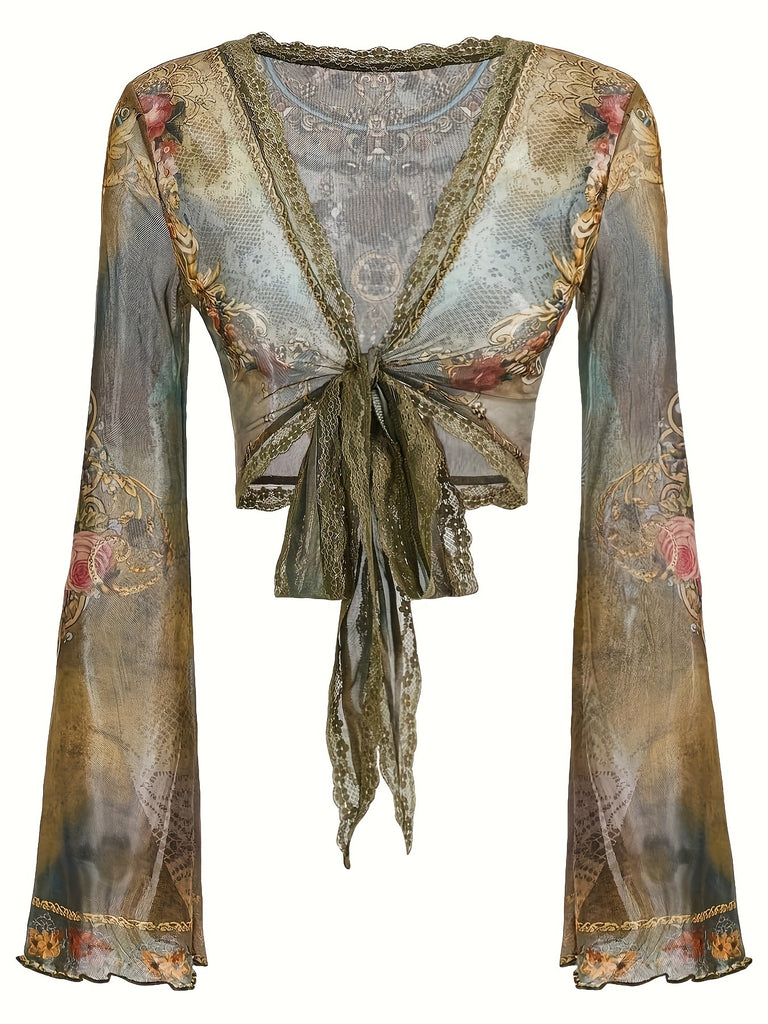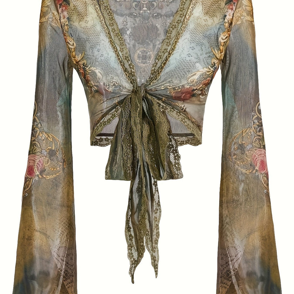 High Stretch Deep V-Neck Print Long Sleeve Crop Top for Women - Tie Detail, Machine Washable - Perfect for Spring/Summer/Fall