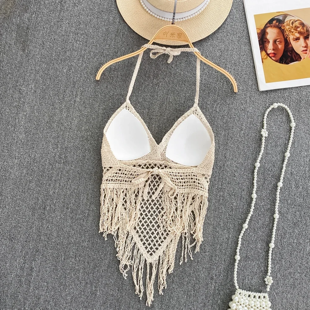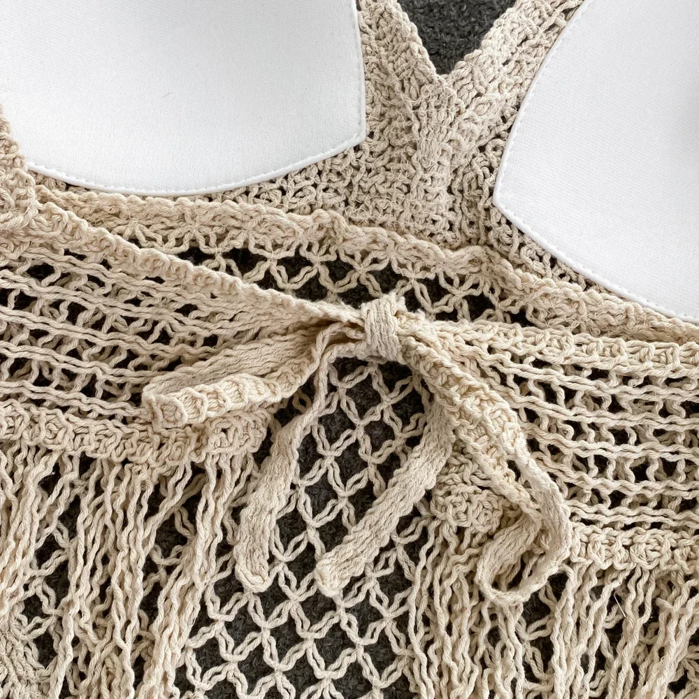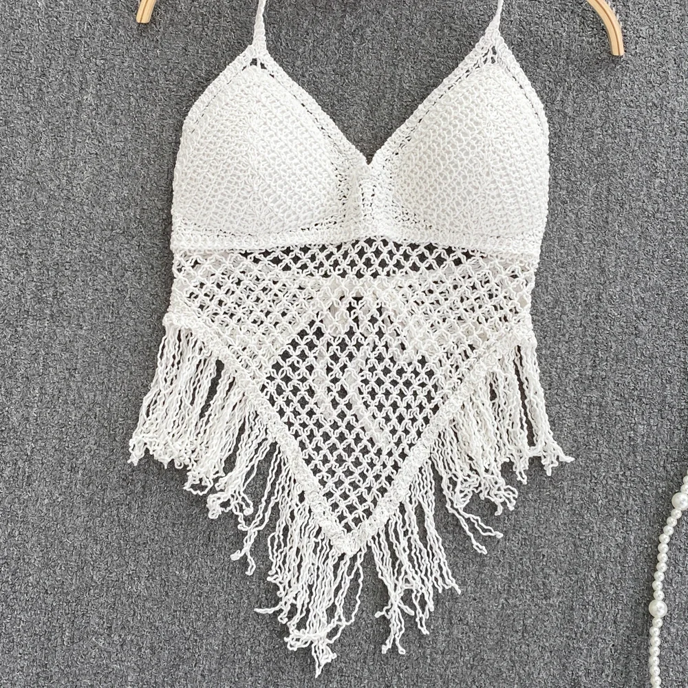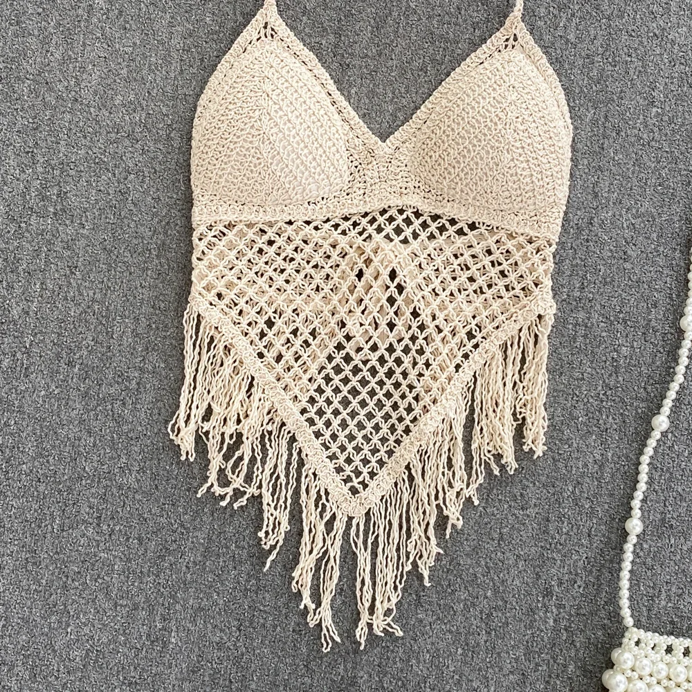 Knitted Tassels Hollow Out Tanks Camis for Women Bohemia Style Hault Sleeveless Sexy Femme Corset Crop Tops Beach Tank Camisoles