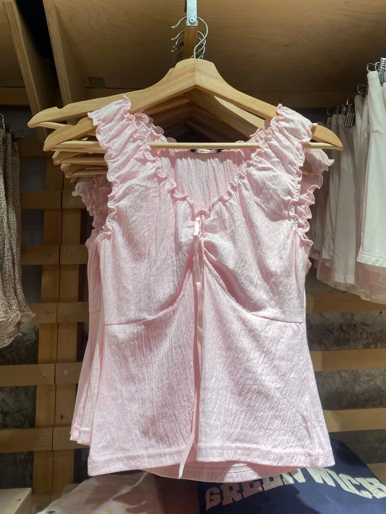 New Pink Fungus Trim Slim Tank Tops Women Summer Sleeveless Sexy Bow V-neck Cotton Crop Top Solid Simple Sweet Cute Vests Y2k