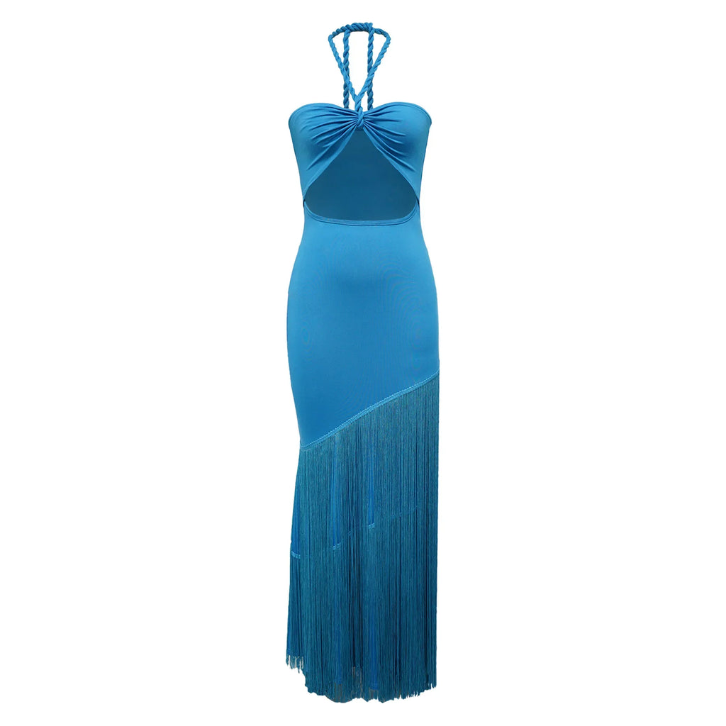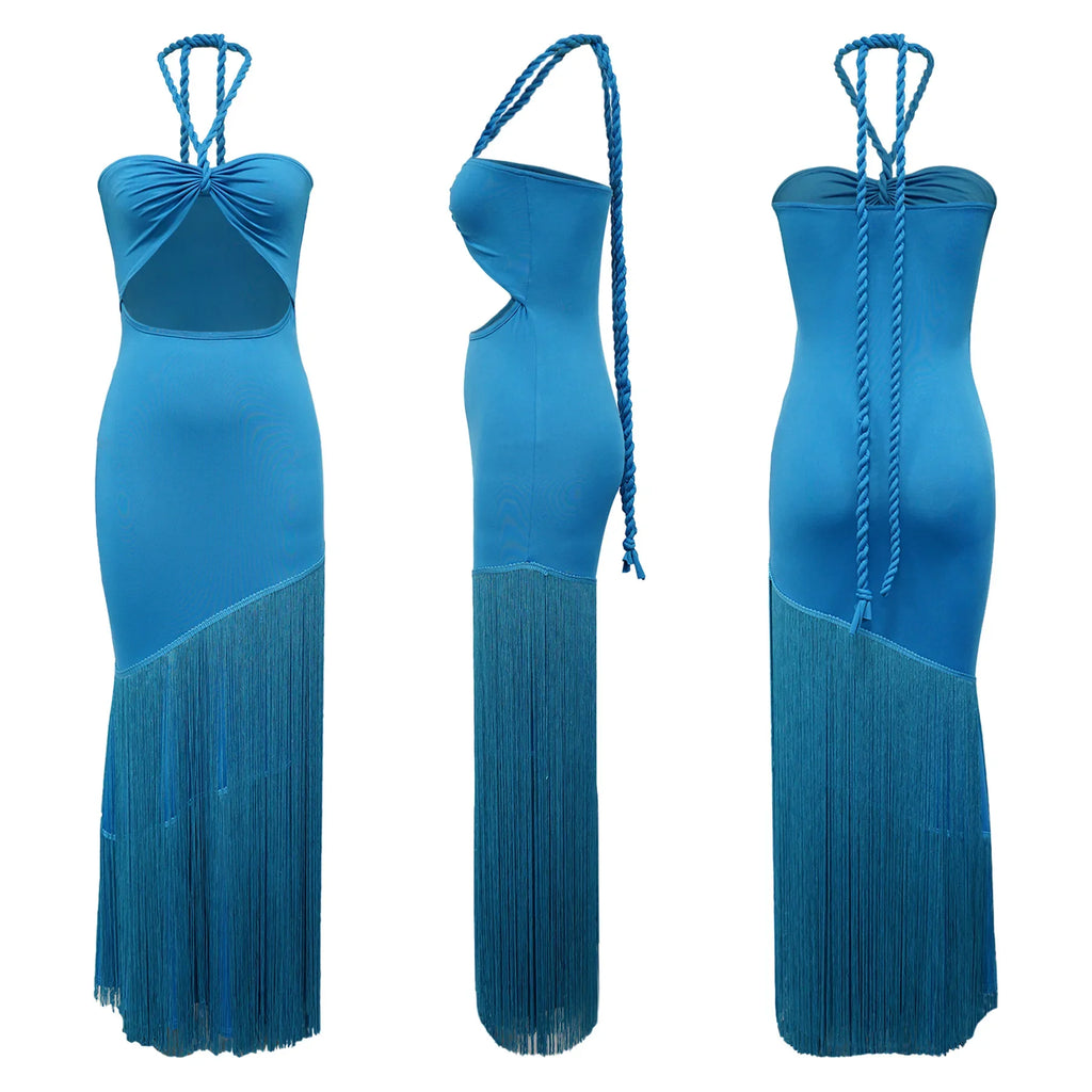 Pbong Summer Trendy Tassel Splice Wrap Dress Empire Waist Ankle-Length Sleeveless Hanging Neck Style Women's Dress New Arrival