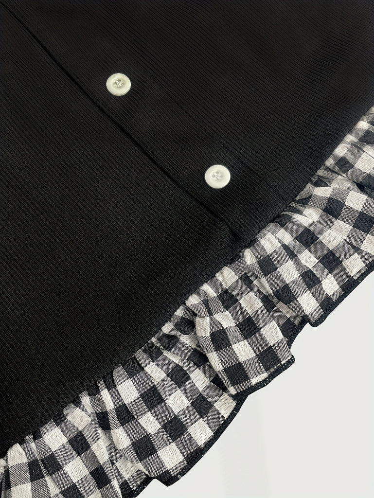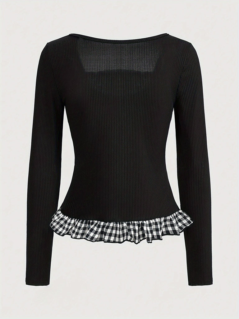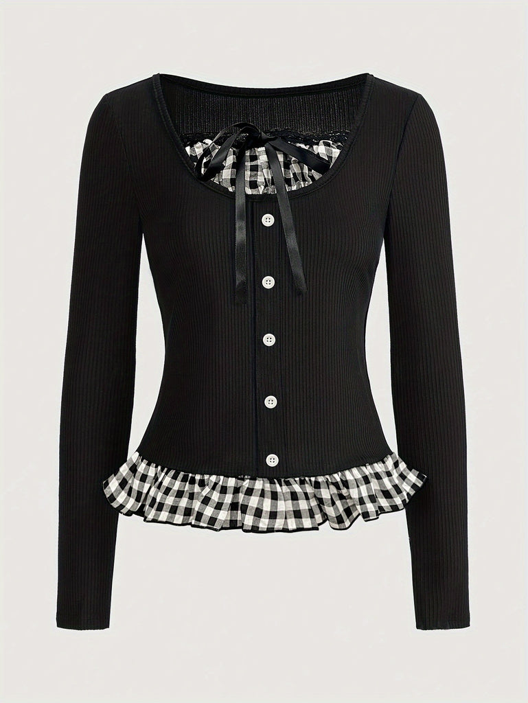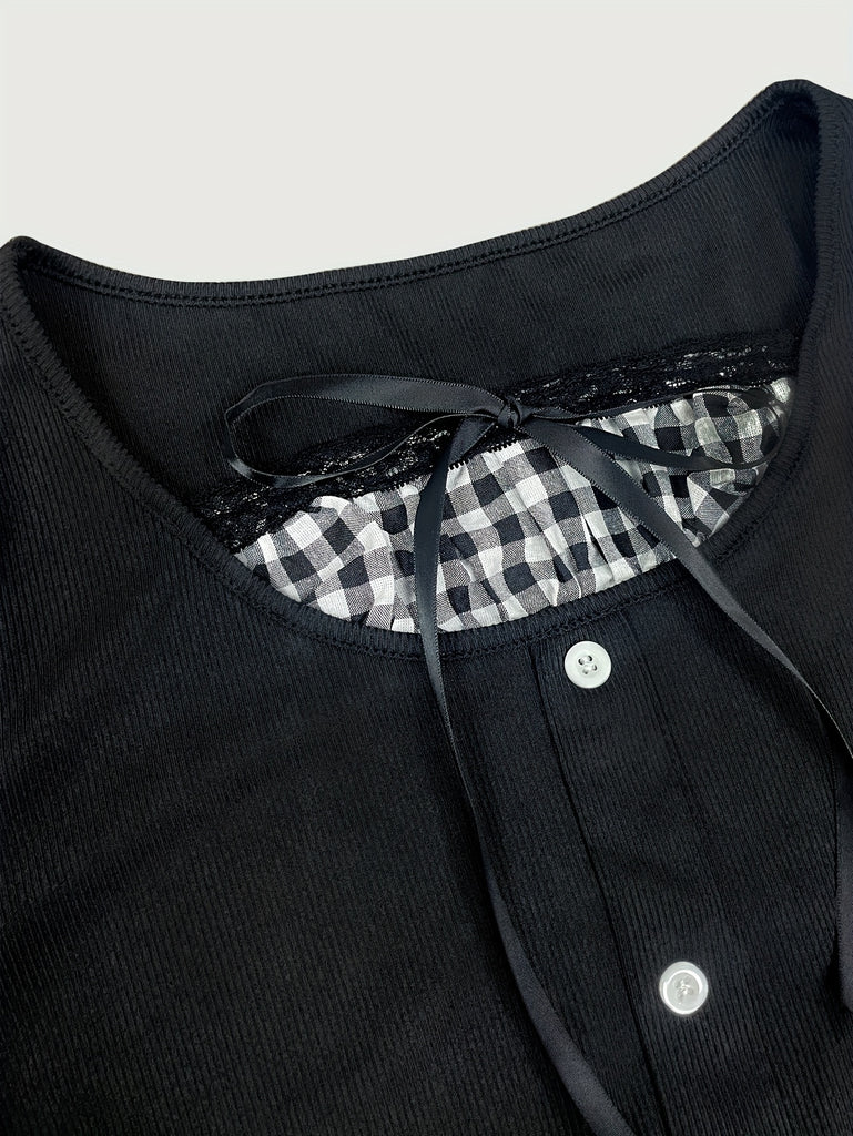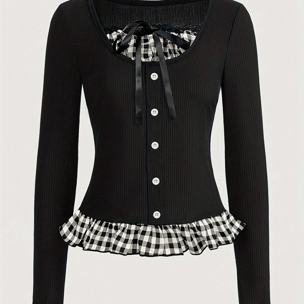 [Slim Contrast Plaid Button T-Shirt] Contrast Plaid Button Slim T-Shirt, Chic Long Sleeve T-Shirt For Spring & Fall, Women's Clothing