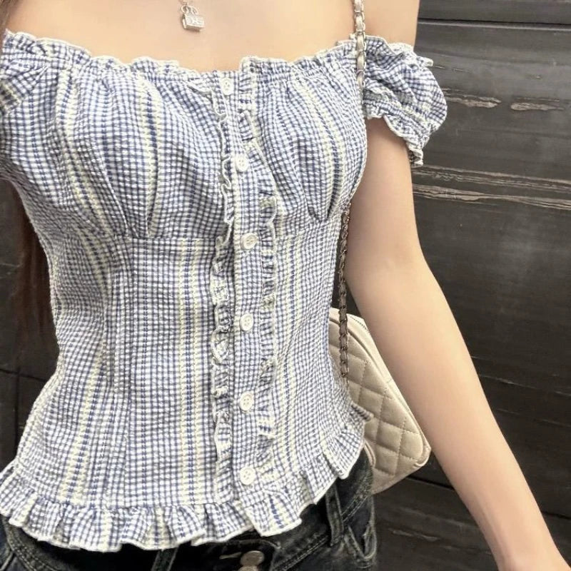 Sweet Blue Plaid Puff Sleeve Women Cropped Shirts Square Collar Korean Fashion Ruffle Blouses Slim Aesthetic Summer