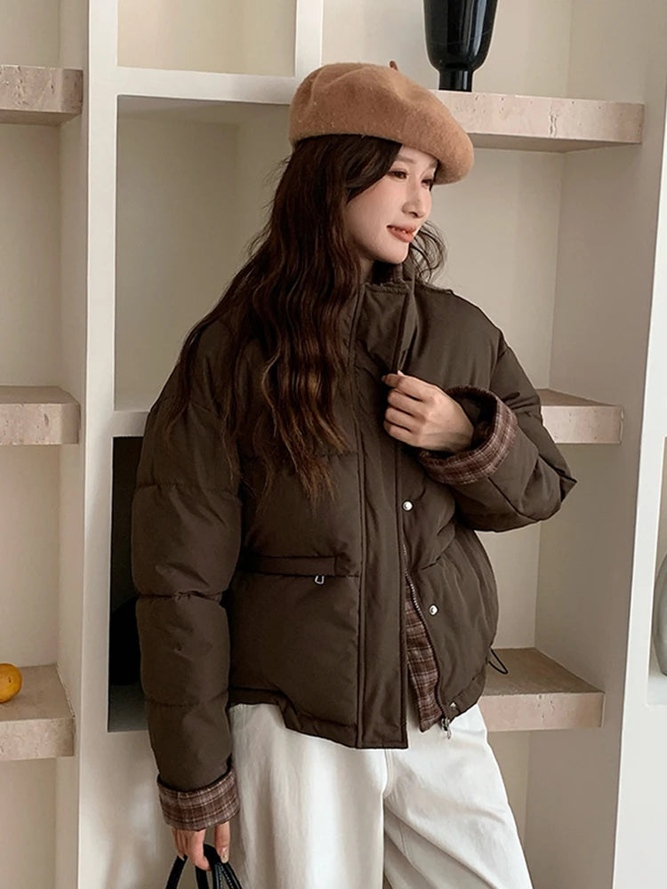 Winter Retro Puffy Parkas Women Warm Thick Plaid Patchwork Cute Coat Casual Preppy Style Korean Long Sleeve Cotton Jackets