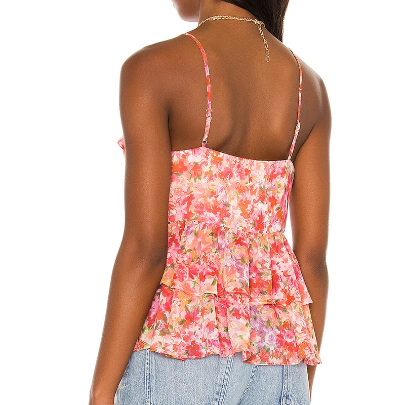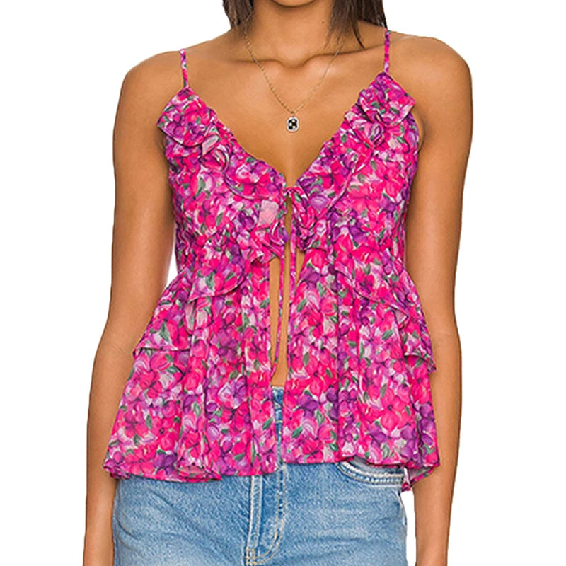 Womens Floral Ruffles Trim Camis Top Y2k V Neck Open Front Crop Tops Vest Beach Vacation Going Out Teen Girls Summer Tank Tops