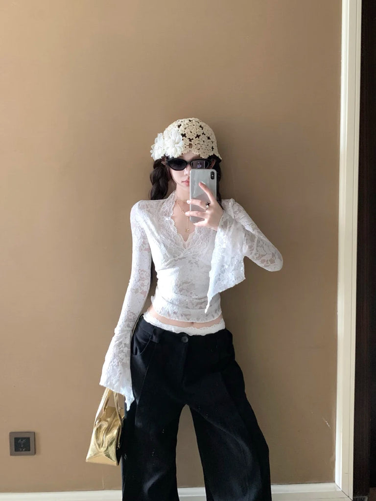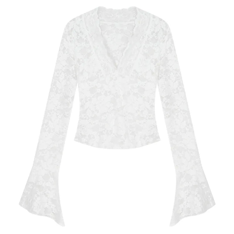 Women's Long Sleeve Lace Top V-neck Flared Sleeve Sheer Lace Crop T-shirt Teen-girl Coquette Fairycore Y2K Outfit