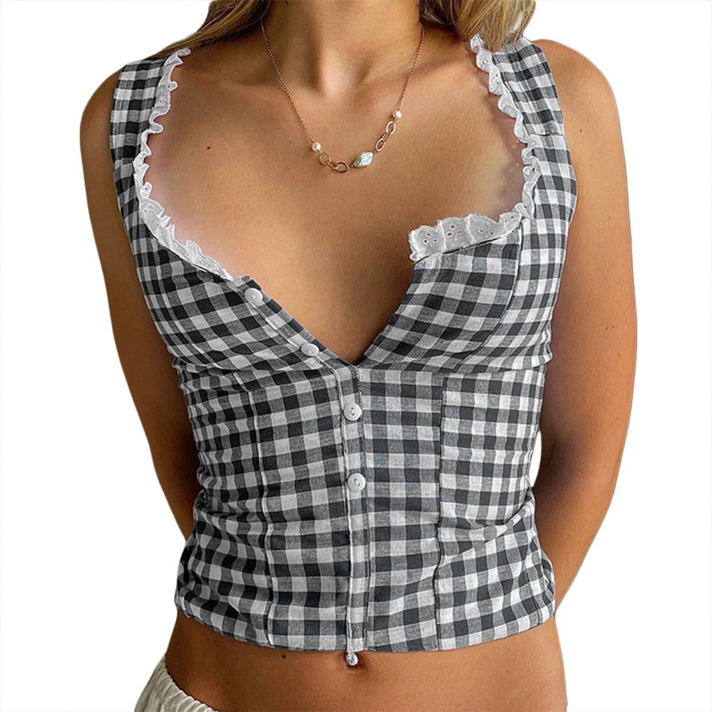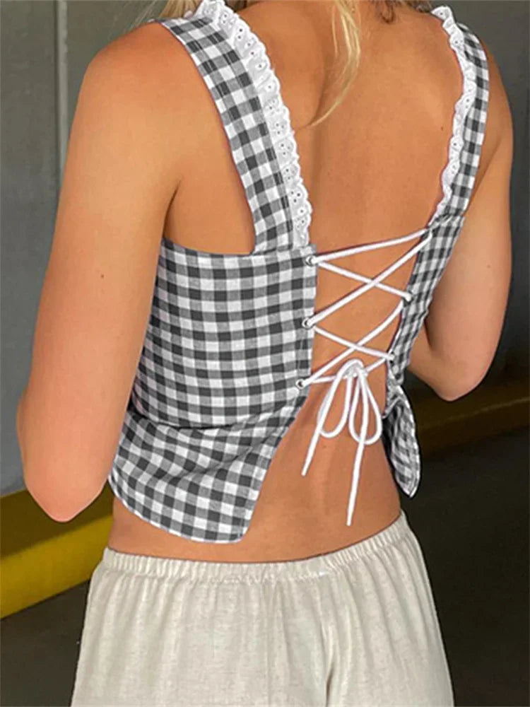 Women's Retro Plaid Tank Tops Sleeveless Button Down Lace Trim Cropped Tops Backless Bandage Casual Summer Vest Shirts New