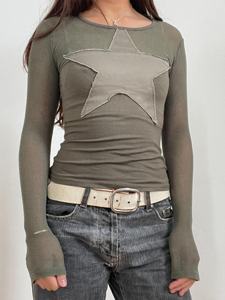 Women's Star Patch Tops Slim Round Neck Long Sleeve T-Shirt Casual Streetwear for Fall