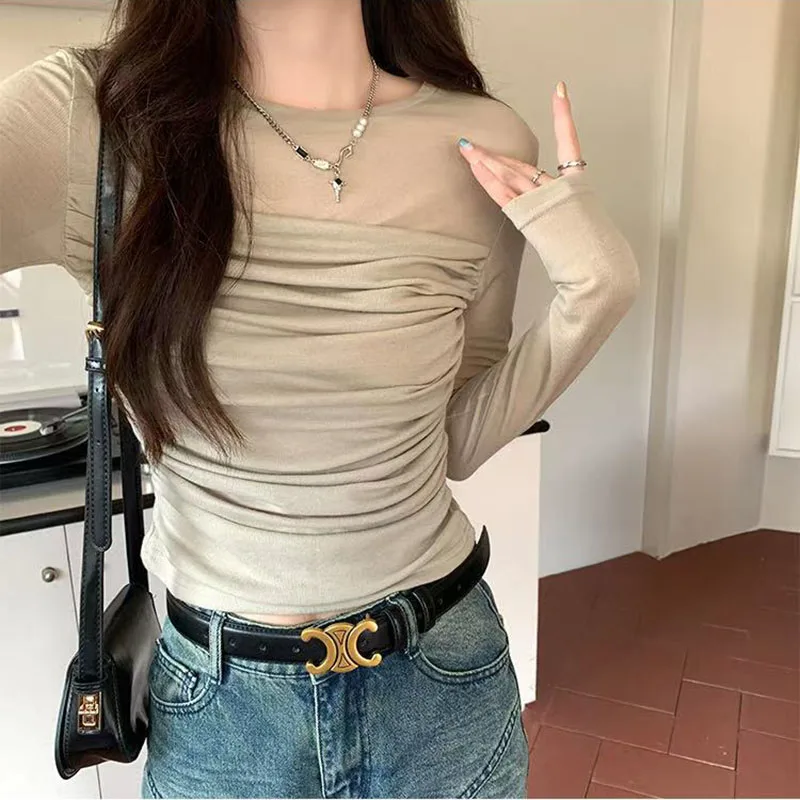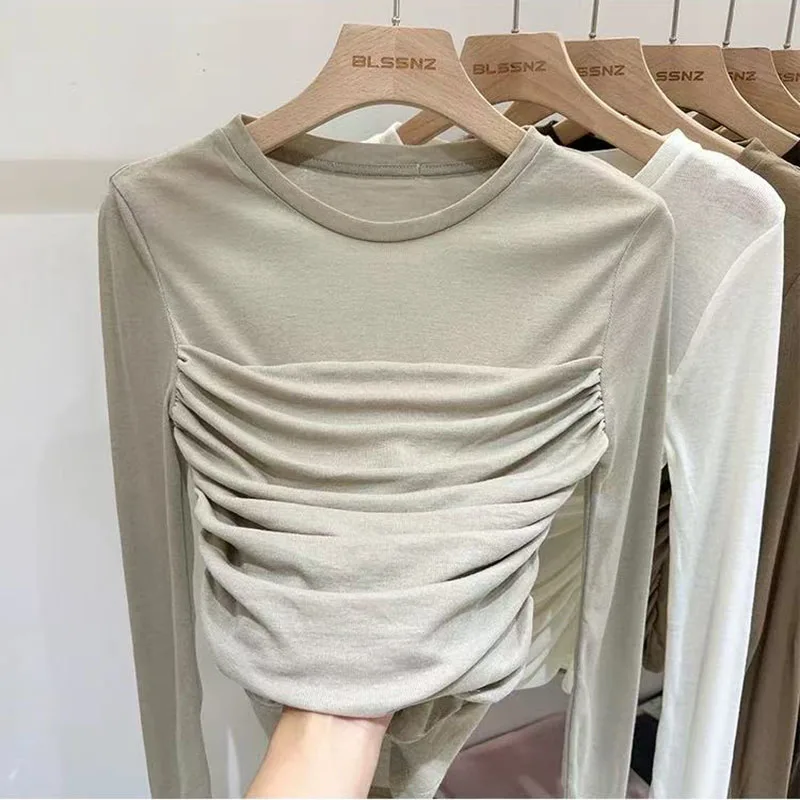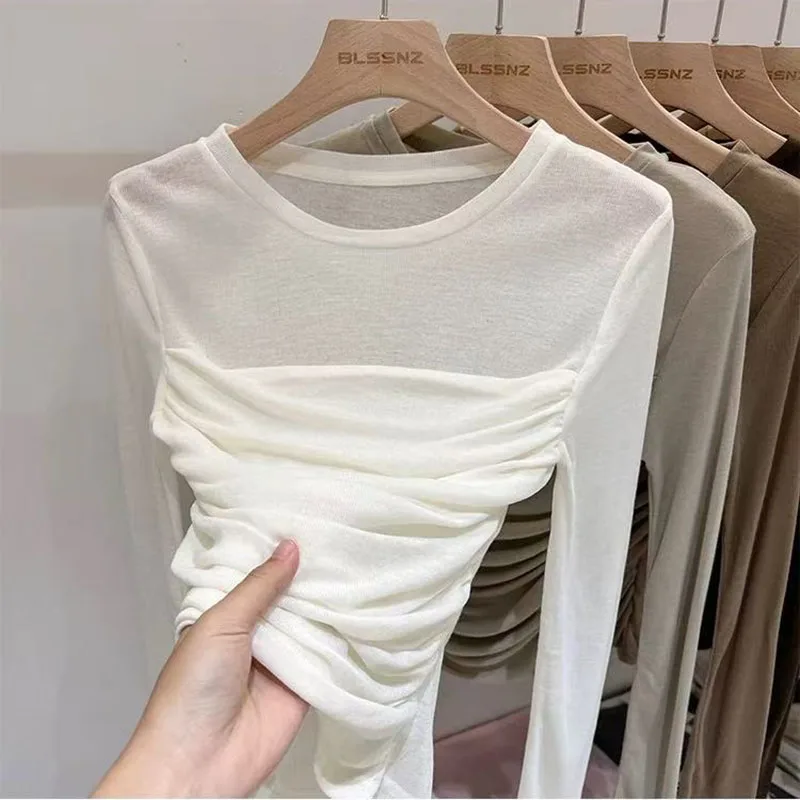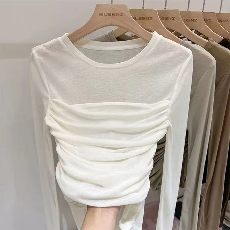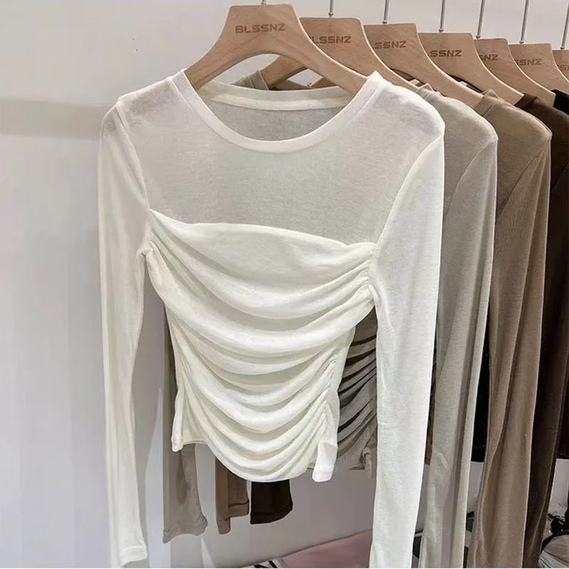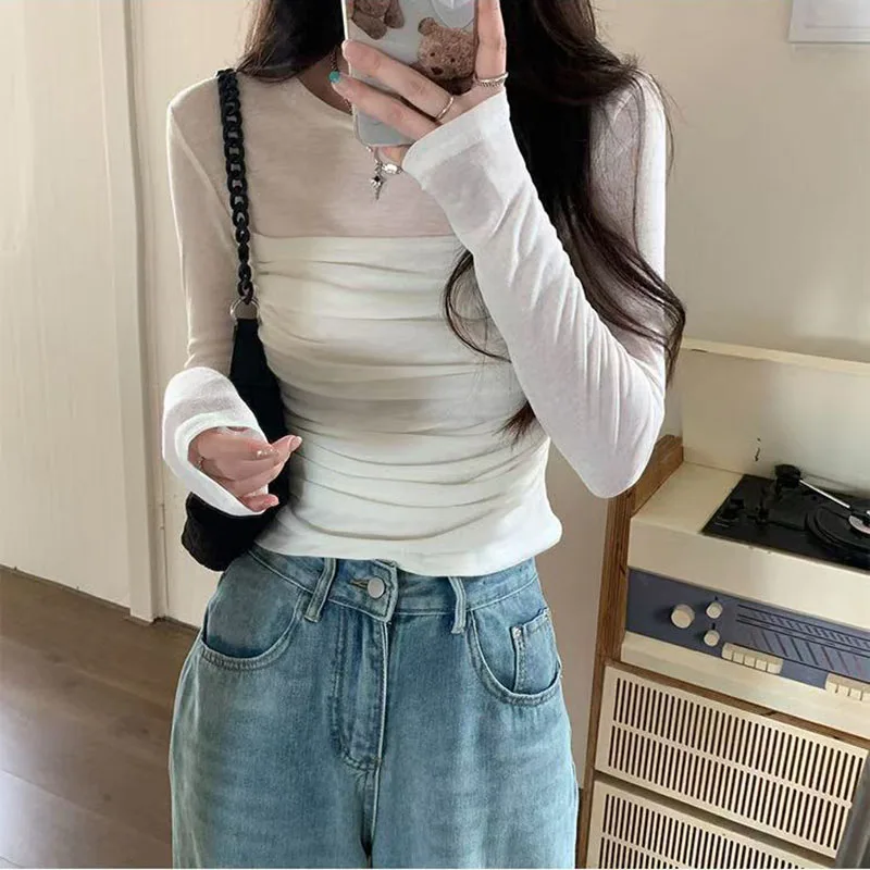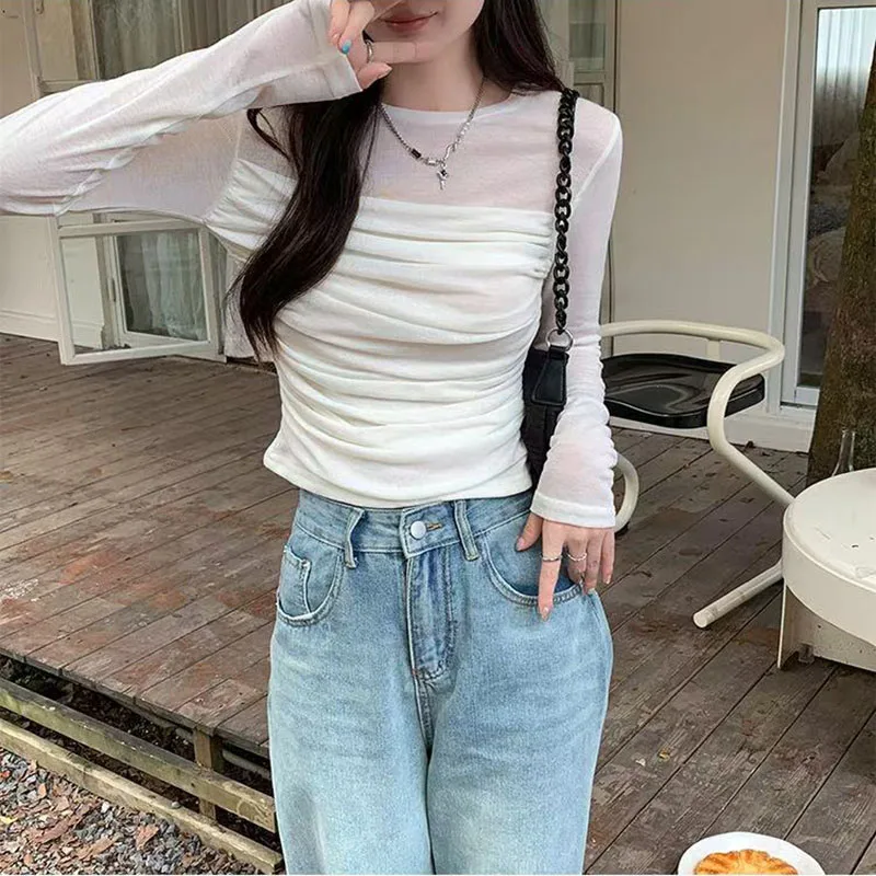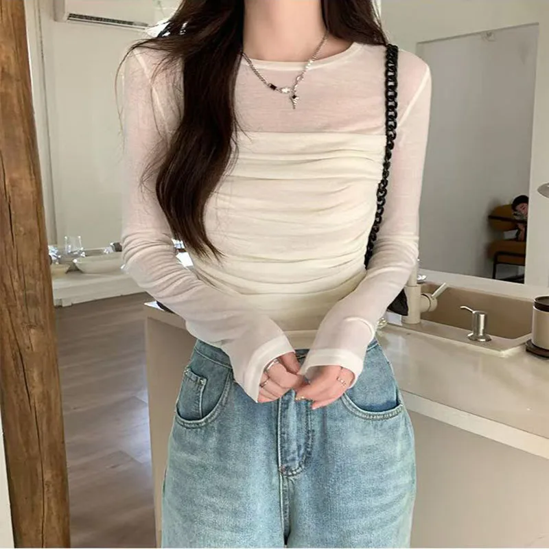 Y2K Long Sleeve Mesh Women T Shirt Spring Fashion Sexy O Neck Slim Female Tops Korean Chic Folds Cropped Bottoming Tees New
