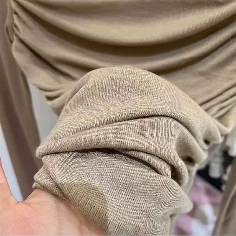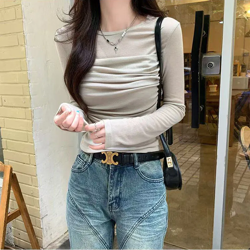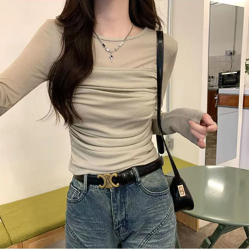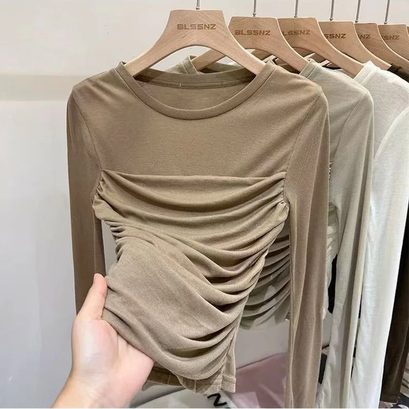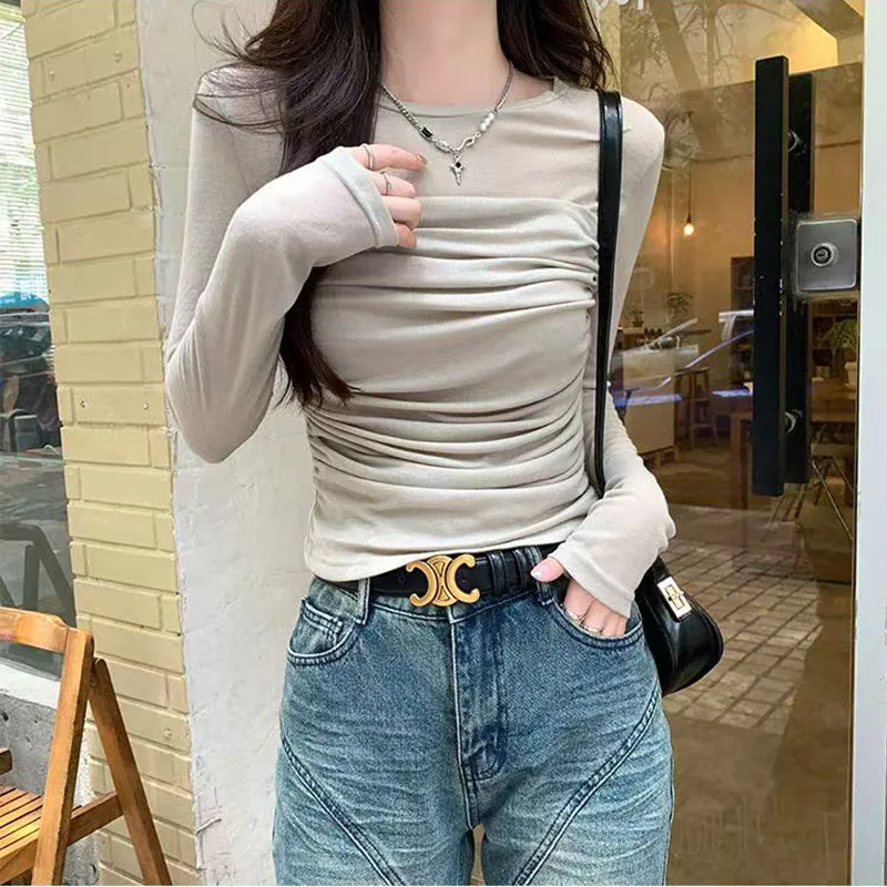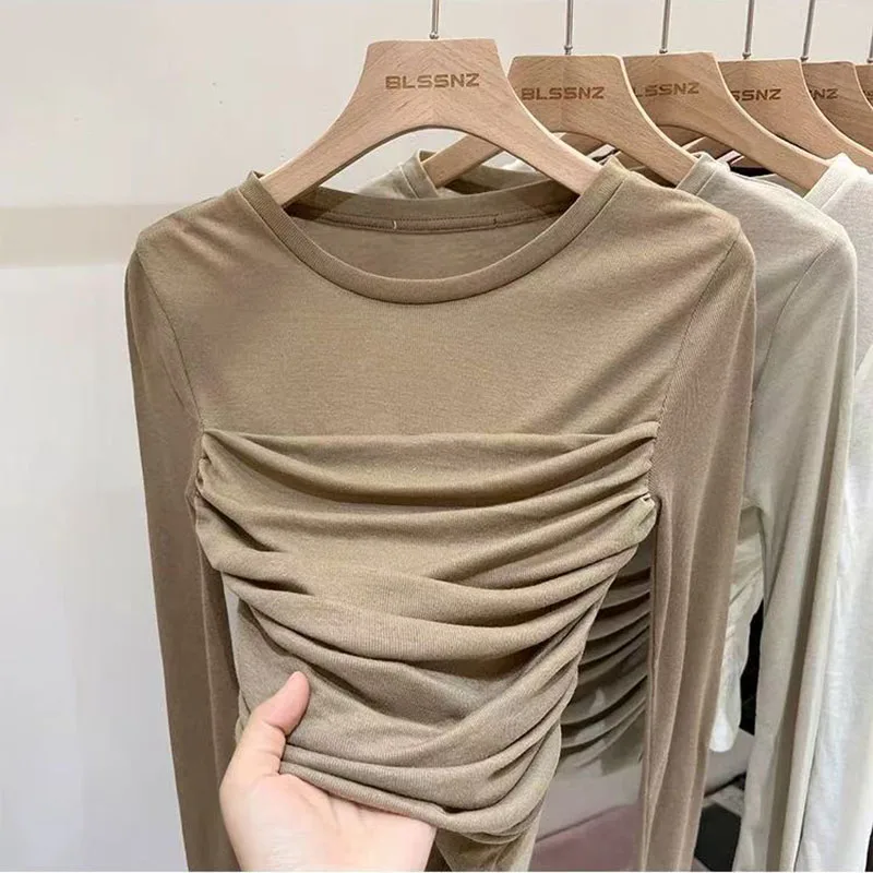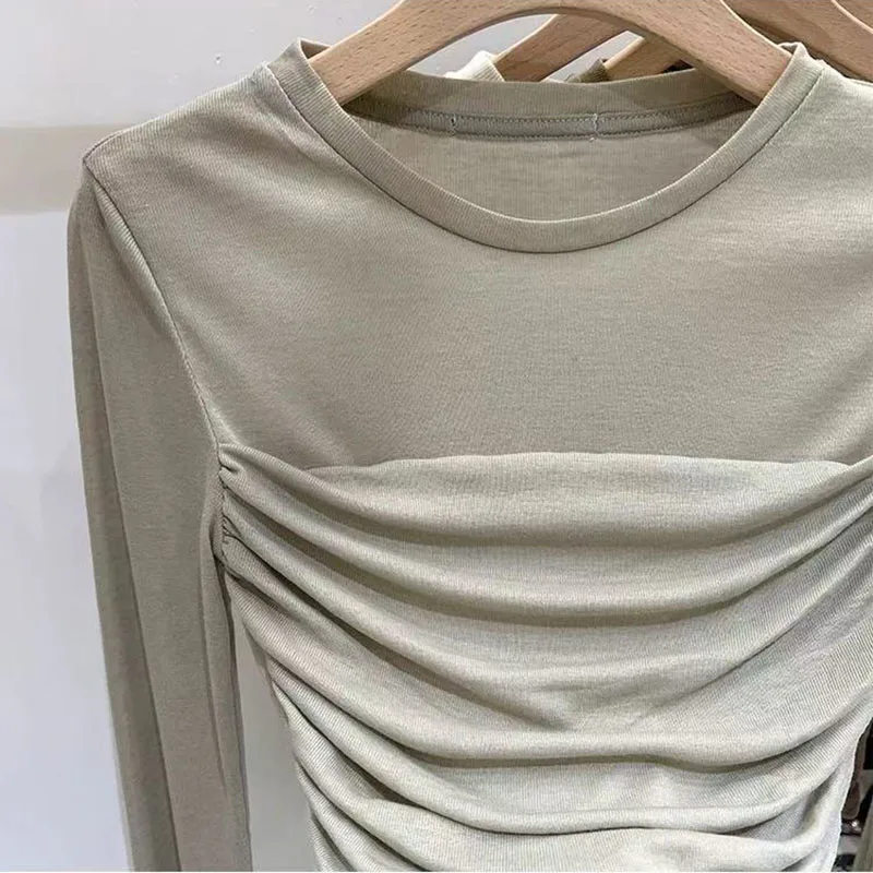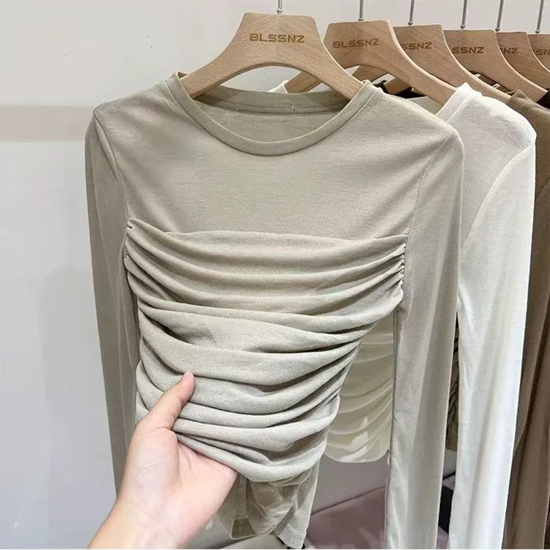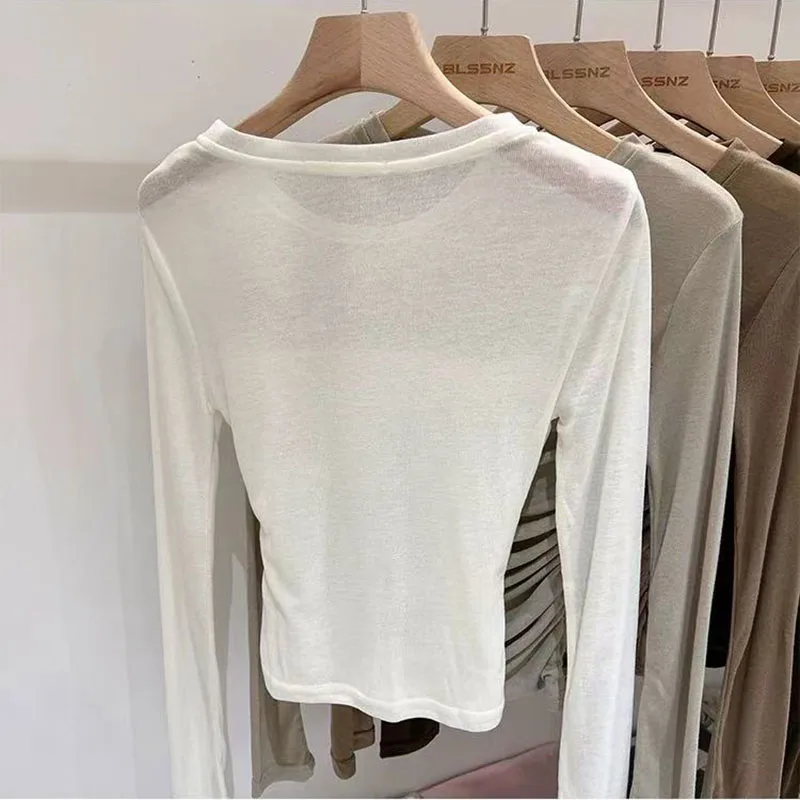 Y2K Long Sleeve Mesh Women T Shirt Spring Fashion Sexy O Neck Slim Female Tops Korean Chic Folds Cropped Bottoming Tees New