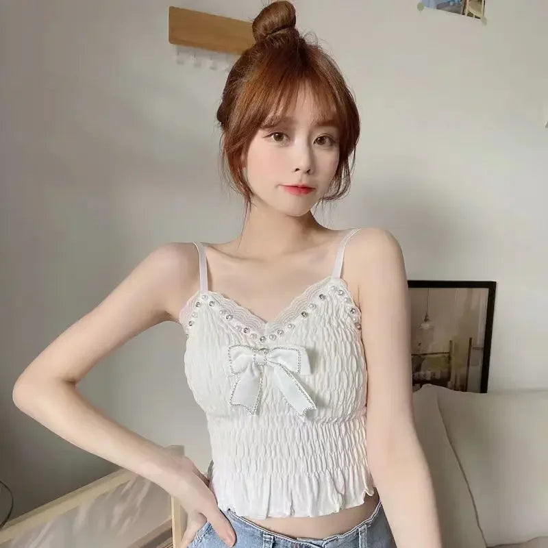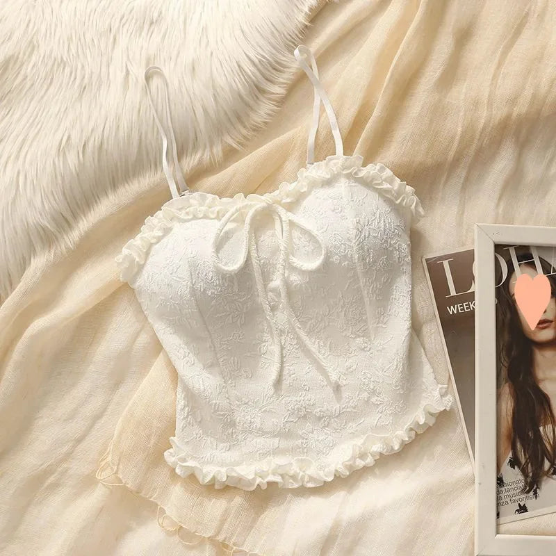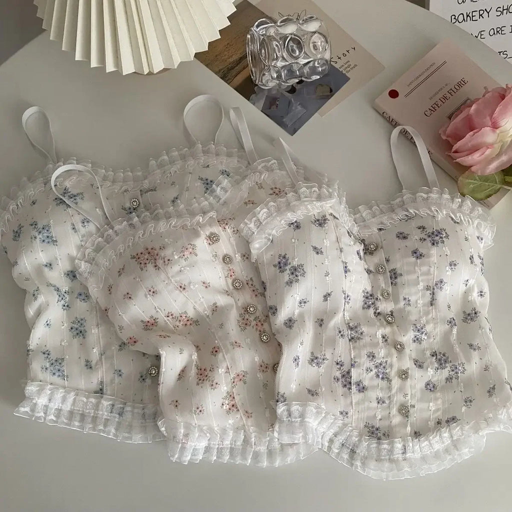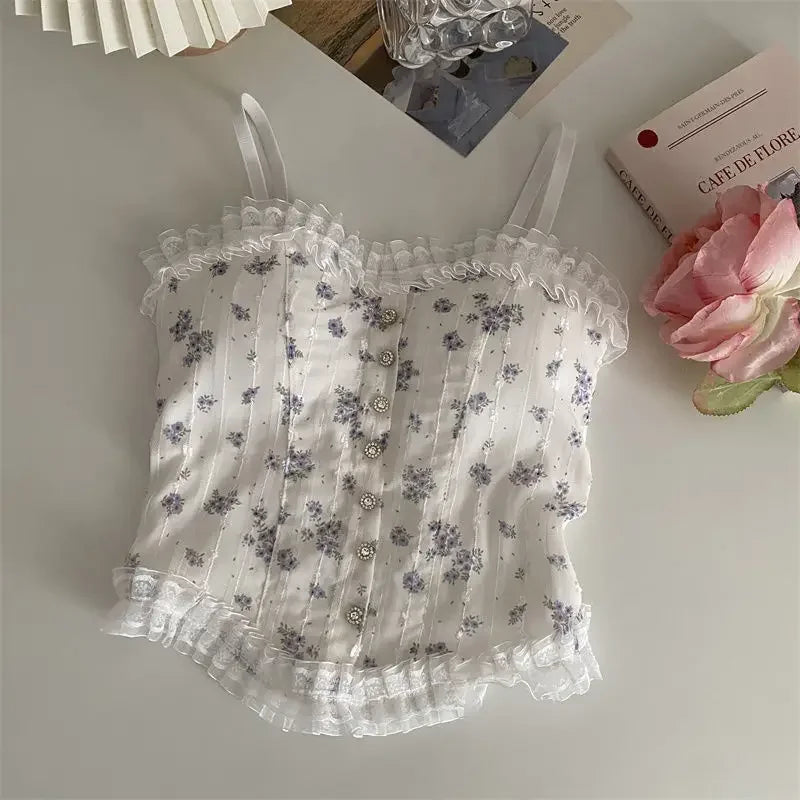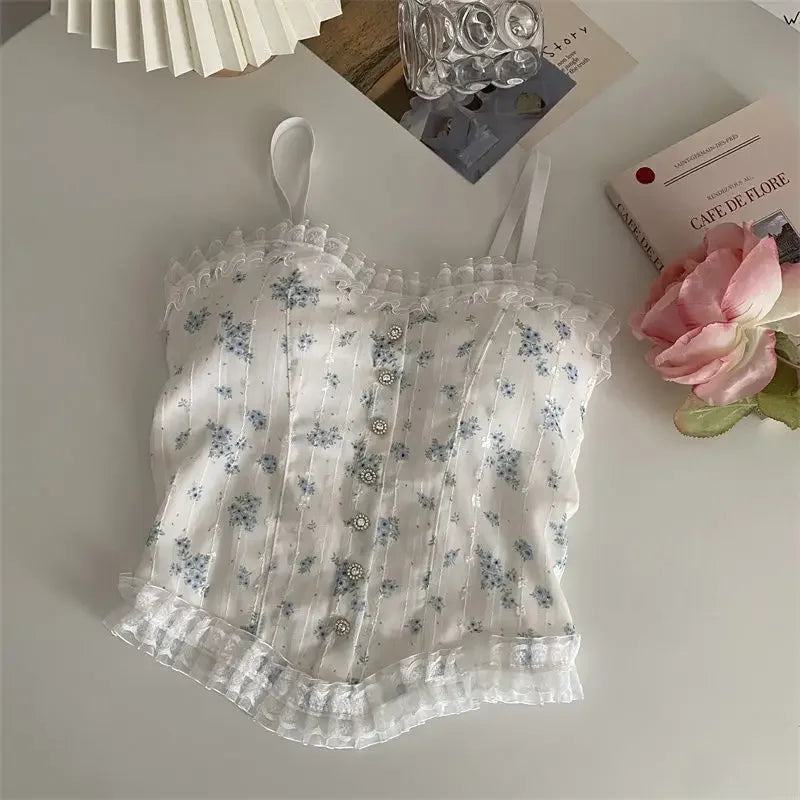 Y2k Tops French Floral Wood Ear-hem Camisole Women's Outer Wear with Breathable Lace Back-beautiful Underwear for Summer