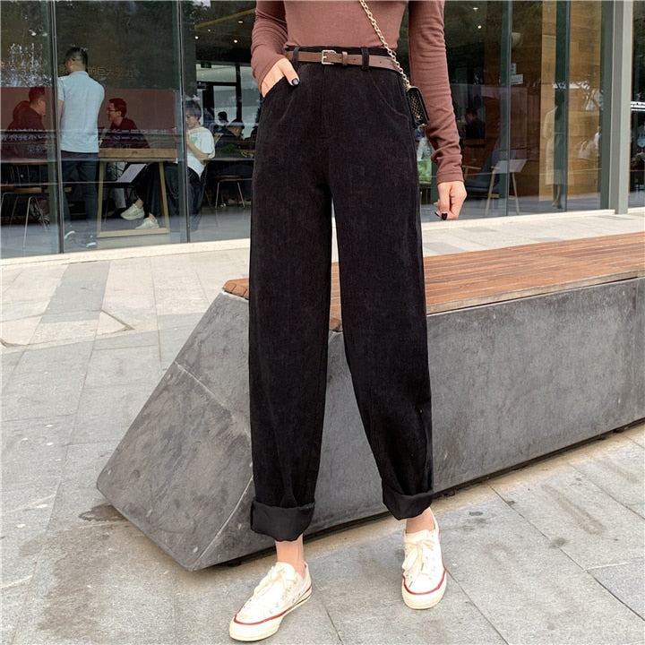 Spring New Women's Casual Loose Corduroy Wide Leg Pants Fashion Full Length Trousers With Sashes Female Bottoms B01308O