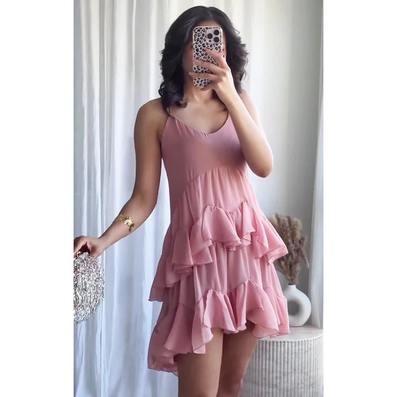 Asymmetric Ruffle Hic Party Dress For Summer V-neck Solid Color Pink Fashion Women Slip Dress Streetwear Holiday Female Clothes