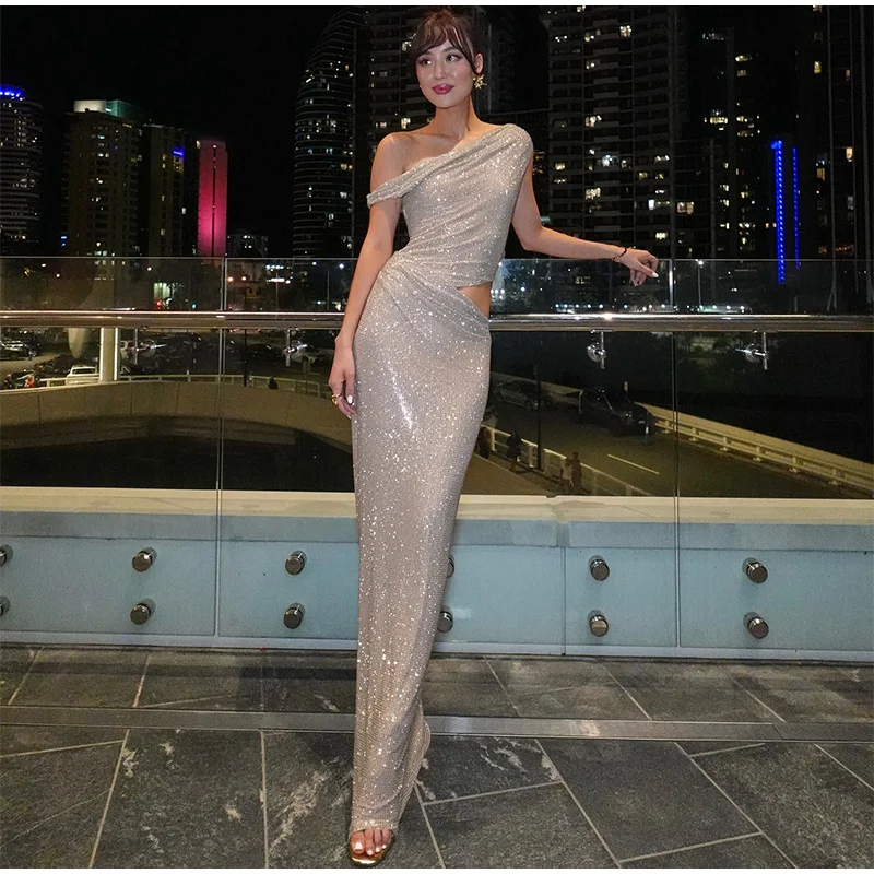 Retro Sequin Single Shoulder Long Dress Women Elegant Glitter Solid Slim Fit Evening Dresses Female Chic Street Party Vestidos