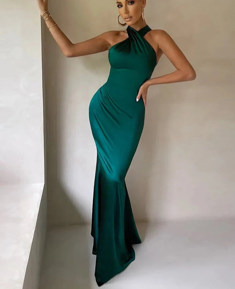 Women Elegant Autumn Winter Halter Party Evening Bodycon Stain Green Long Dress Fall Clothes Wholesale Items