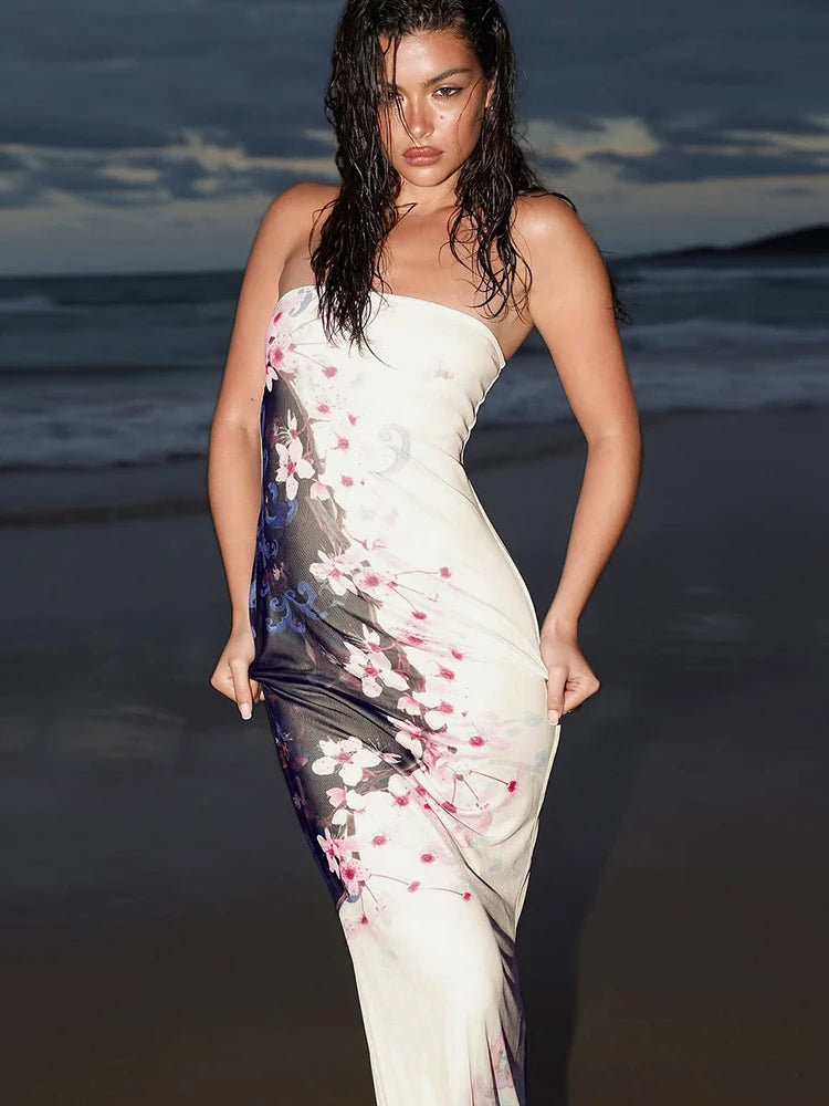 Backless Dress Women Flower Print Contrast Strapless Sleeveless Irregular Bottom Pleated Midnight Club Party Vestidos