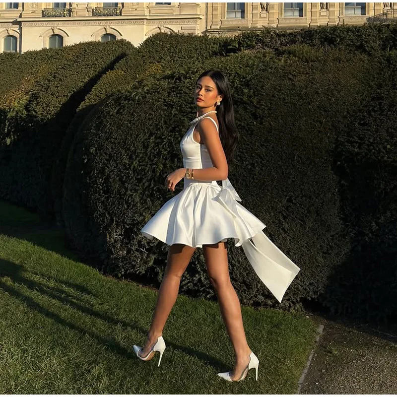 New Sexy Satin Big Bow Skinny Strap Mini Dress Fashion Women Backless High Waist Pleated Dresses Trendy Lady Prom Clubwear