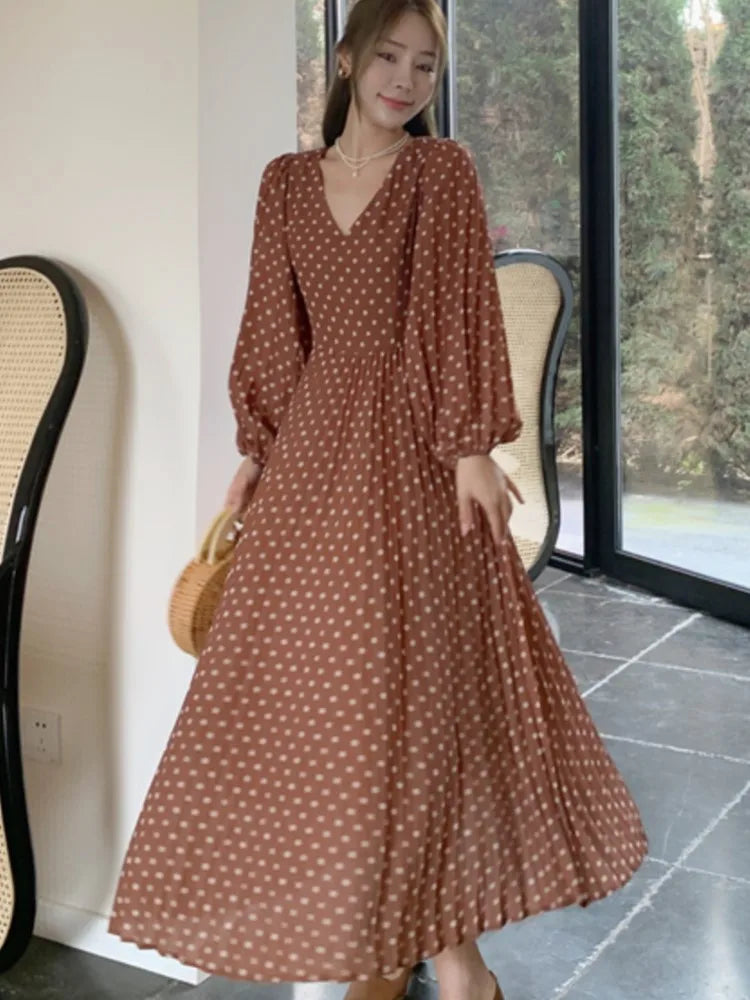 Woman Vintage Polka Dot Long Dresses Elegant V-Neck Slim Lantern Sleeve Dress Holiday Prom Evening Female Clothing Outfits New