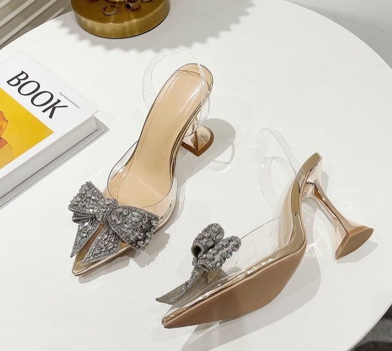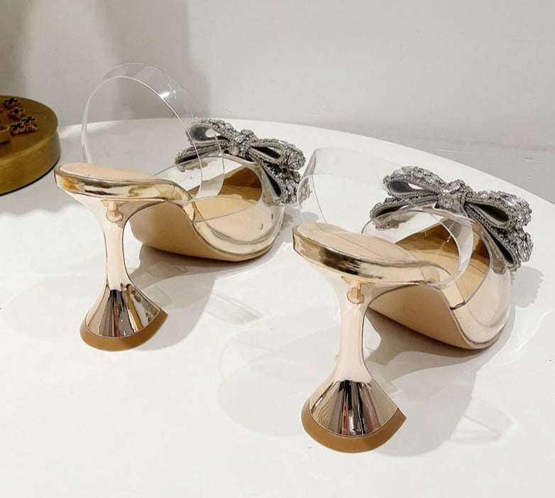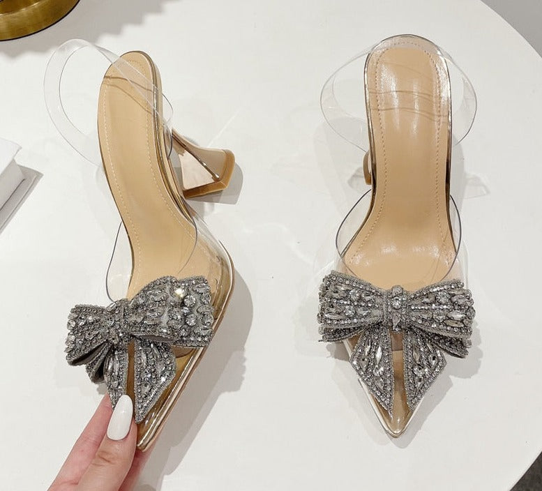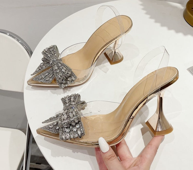 Fashion Crystal Sequined Bowknot Women Pumps Sexy Pointed Toe High Heels PVC Transparent Sandals Wedding Prom Shoes