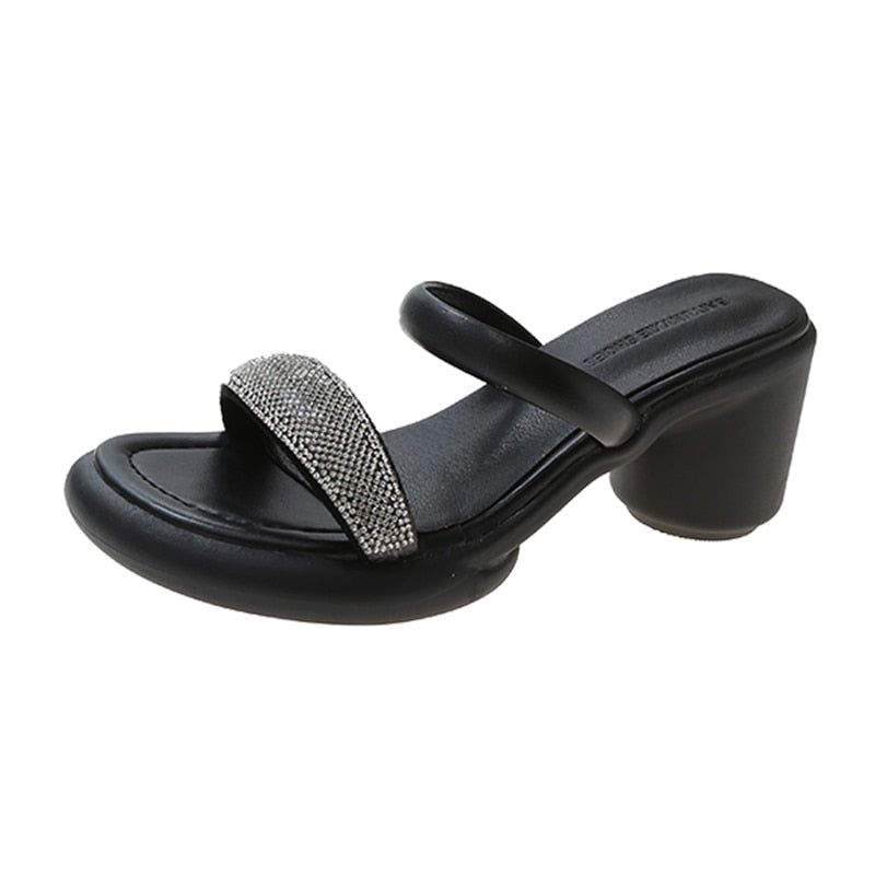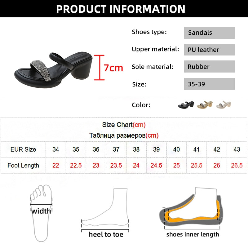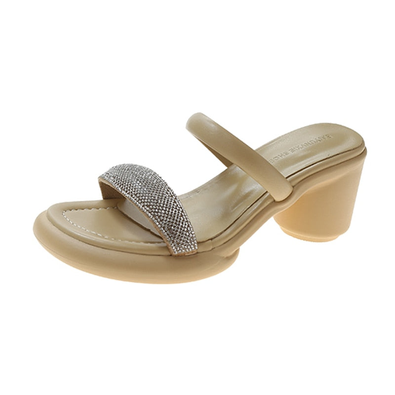 Fashion Crystal Women Sandals Summer Round Heels Gladiator Sandals Woman Beige PU Leather High Heeled Slippers