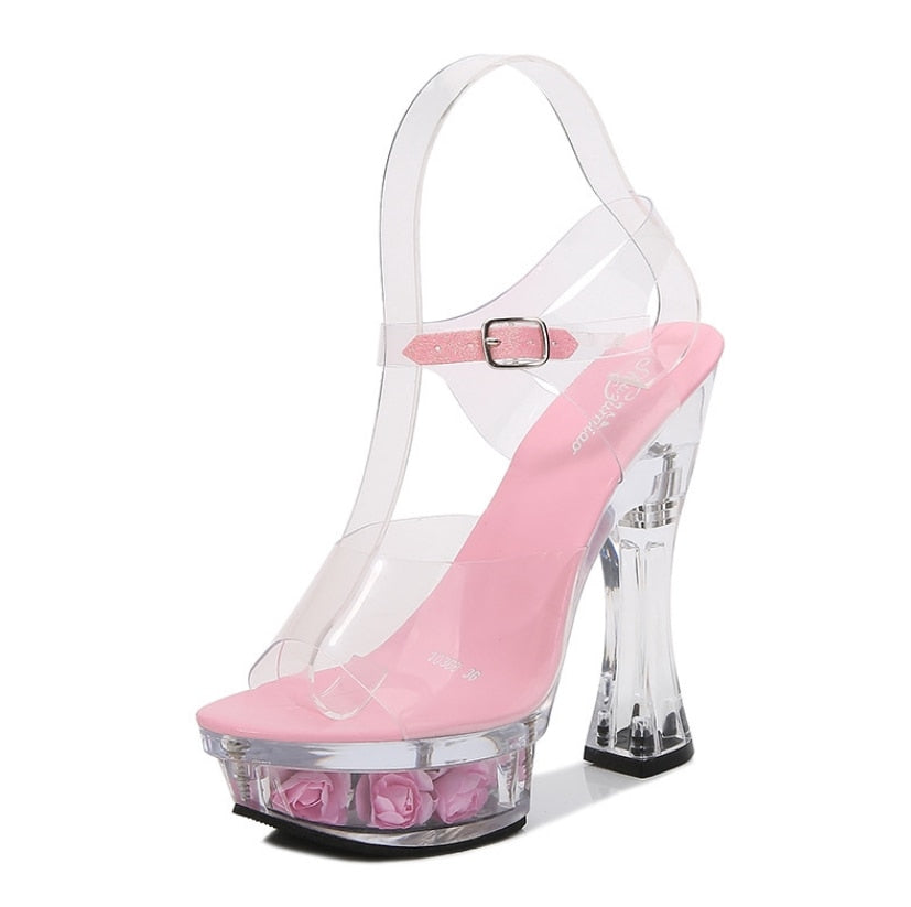 Glowing Sandals Women Summer New Flowers Transparent High Heels 14.5cm Platform Thick heel Ladies Banquet Shoes