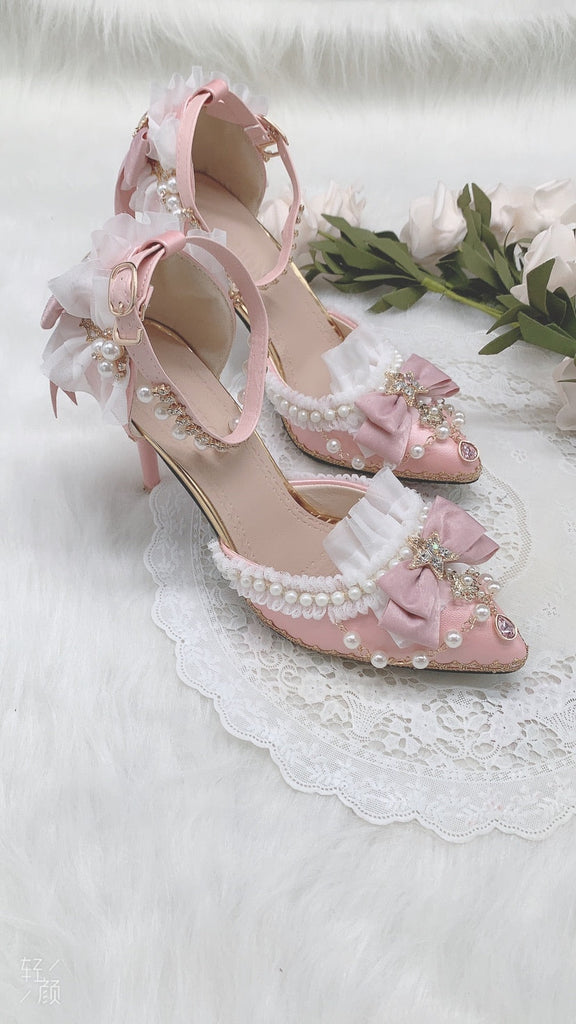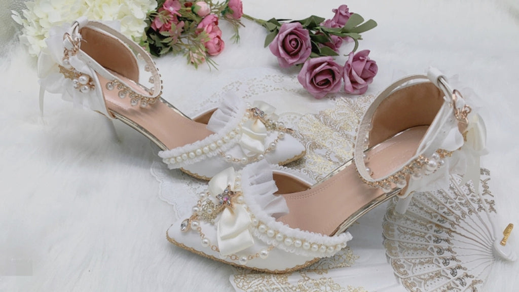 High Heels 8cm Luxury Sweet Women Lolita Wedding Shoes Diamond Lace Bow Tea Party Cos Slingbacks Pointed Toe Ankle Strap Sandals