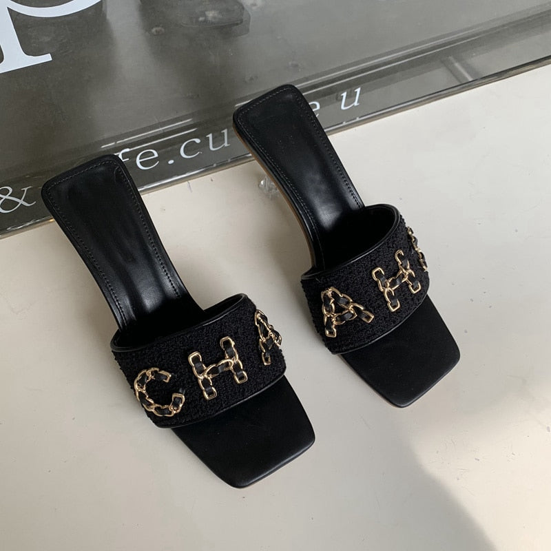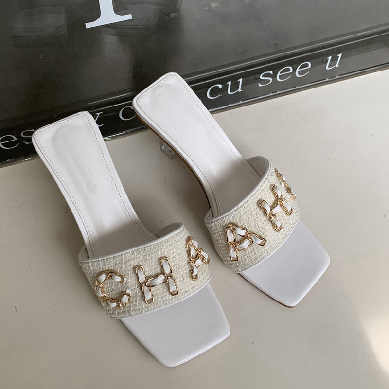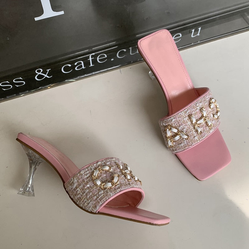Summer New Brand Women Slipper Fashion Square Toe Slip On Ladies Slides Thin High Heel Outdoor Dress Sandal Shoes
