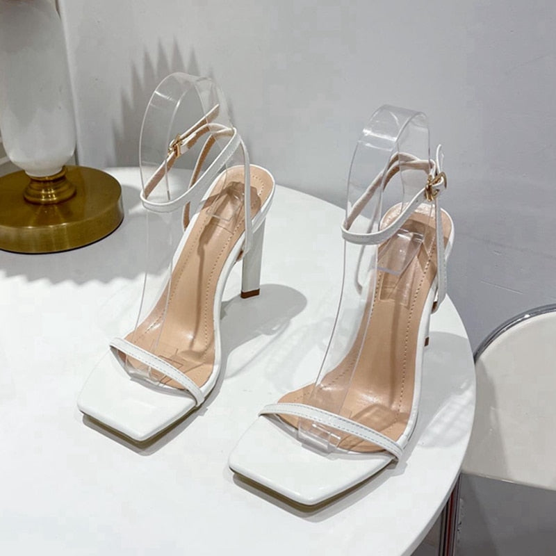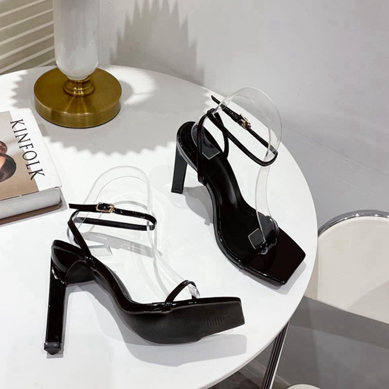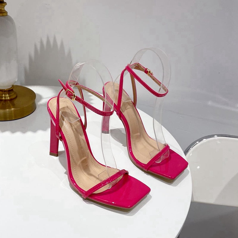 Summer New Narrow Band Women Sandals Shoes Thin High Heel Square Toe Ladies Ankle Buckle Strap Sexy Dress Pumps S