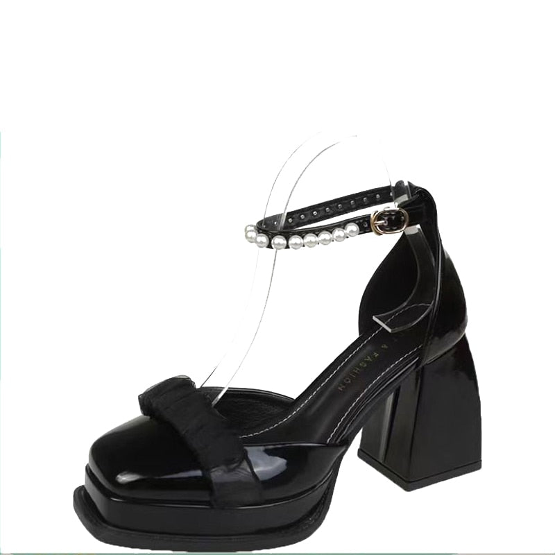 Women Summer High Heels Party Square Toe Pearl Sandals Ladies PU Fshion Platform Shallow Mouth No-slip Retro Pumps Female