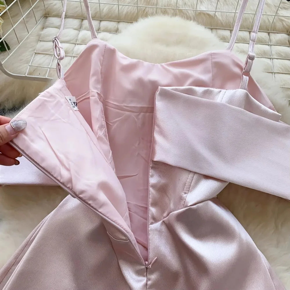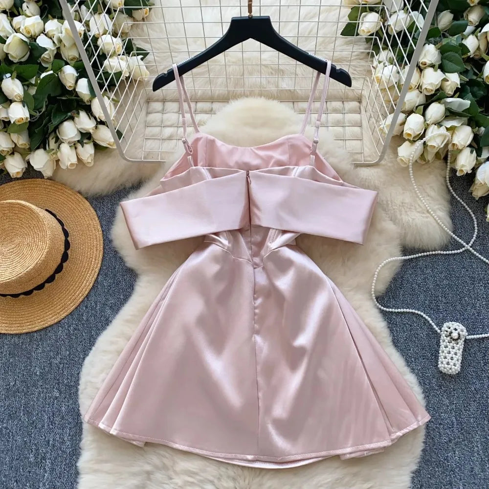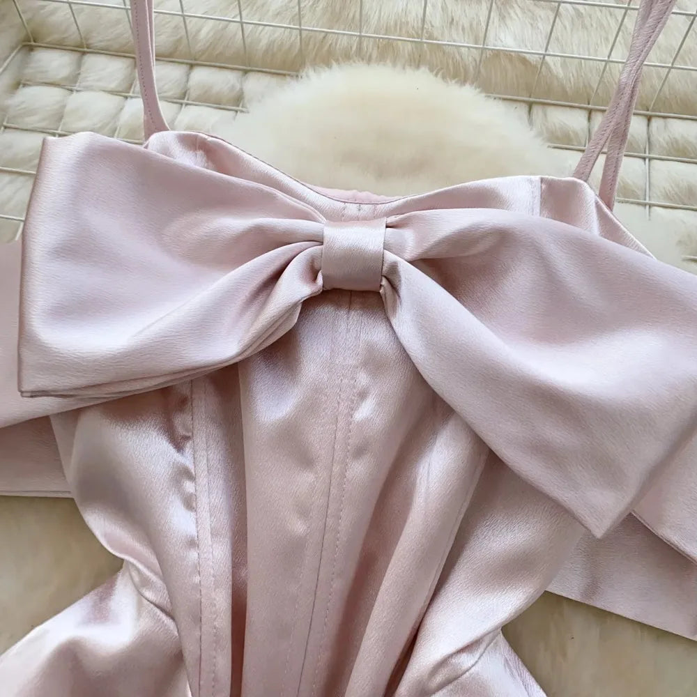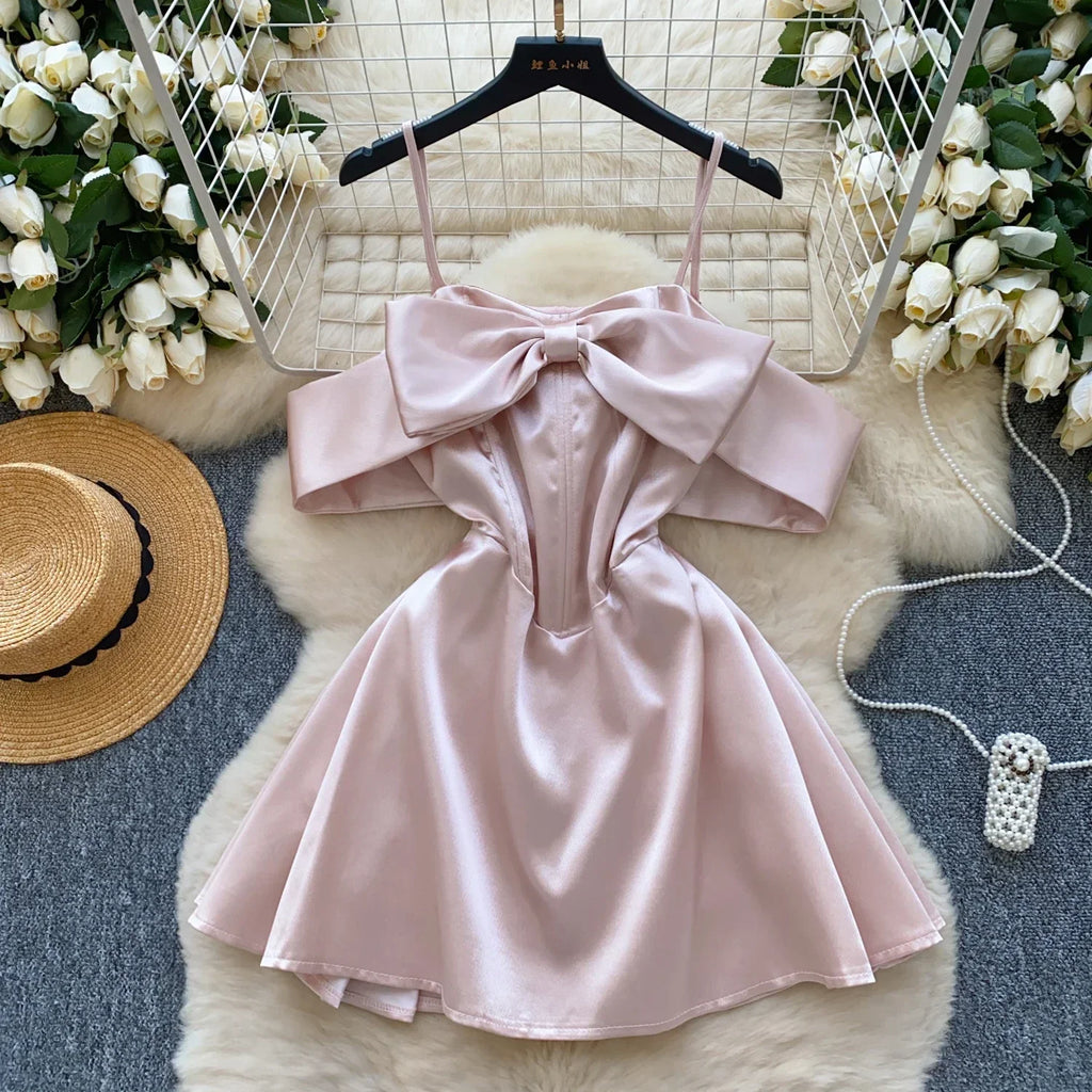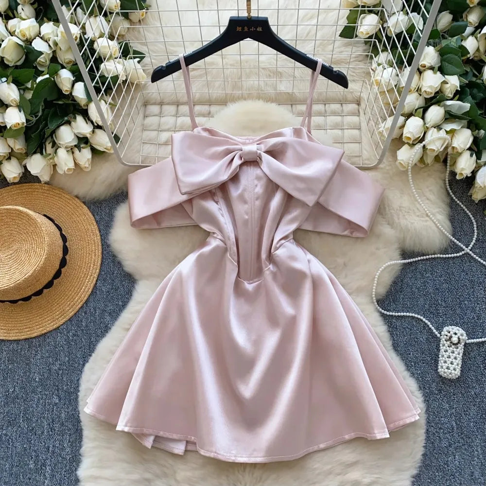 Elegant Sleeveless Vintage Butterfly Bow Sexy Off Shoulder Satin Slim A-line Straps Dresses Birthday Party High Street Clothing