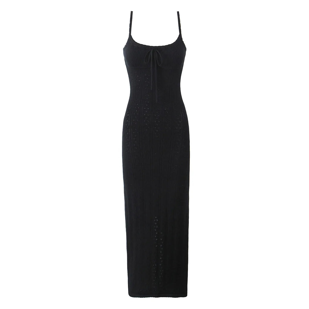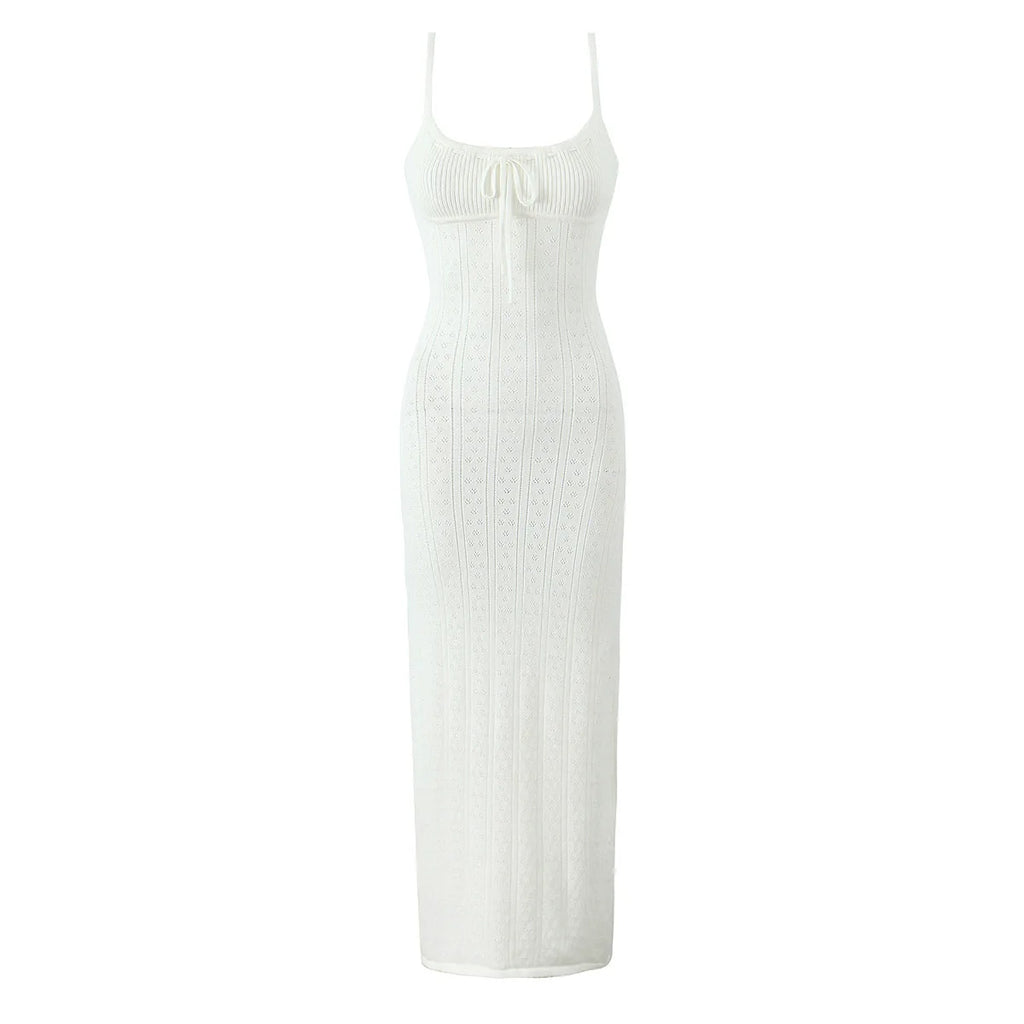 Eyelets Knit Tight Long Dress White Solid Color Women Dress For Summer Spring Square Collar Sleeveless Sexy Beach Party Dresses