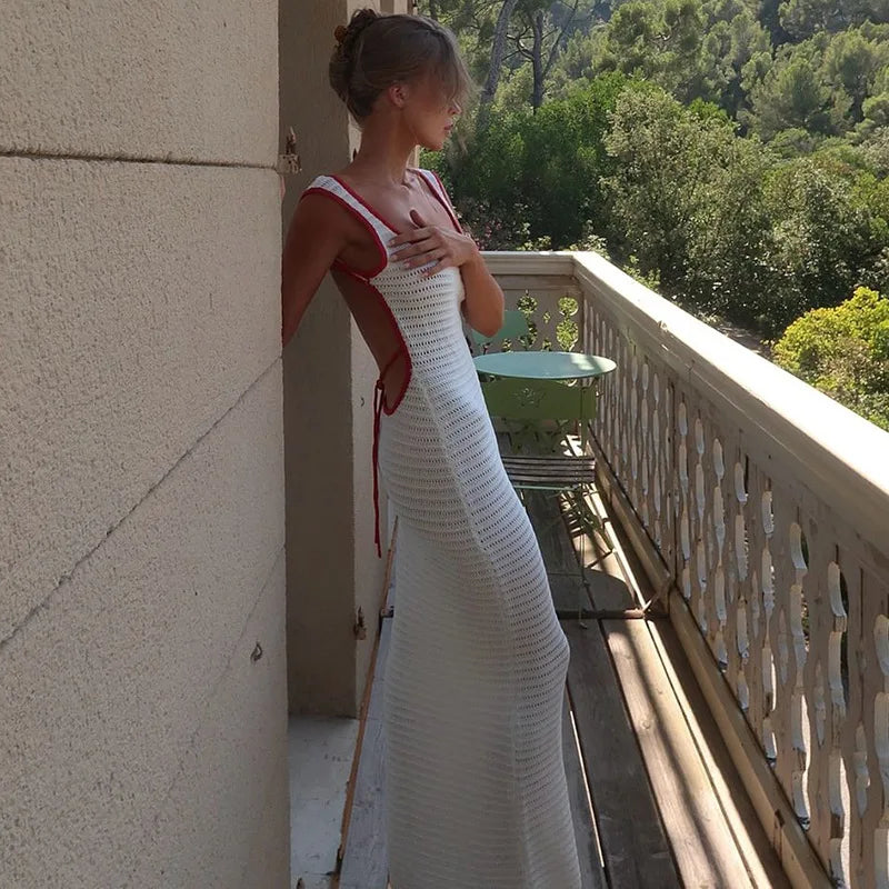 Sexy Backless Knitting White Long Dress Women's Square Collar Sleeveless Tank Dress New Summer Transprent Beach Holiday Vestidos