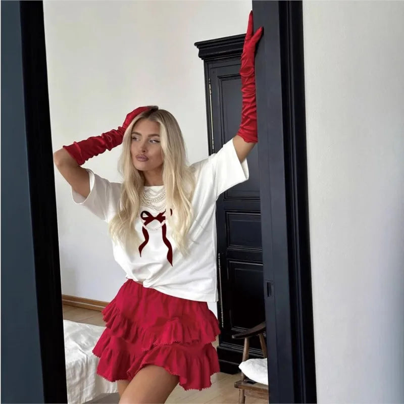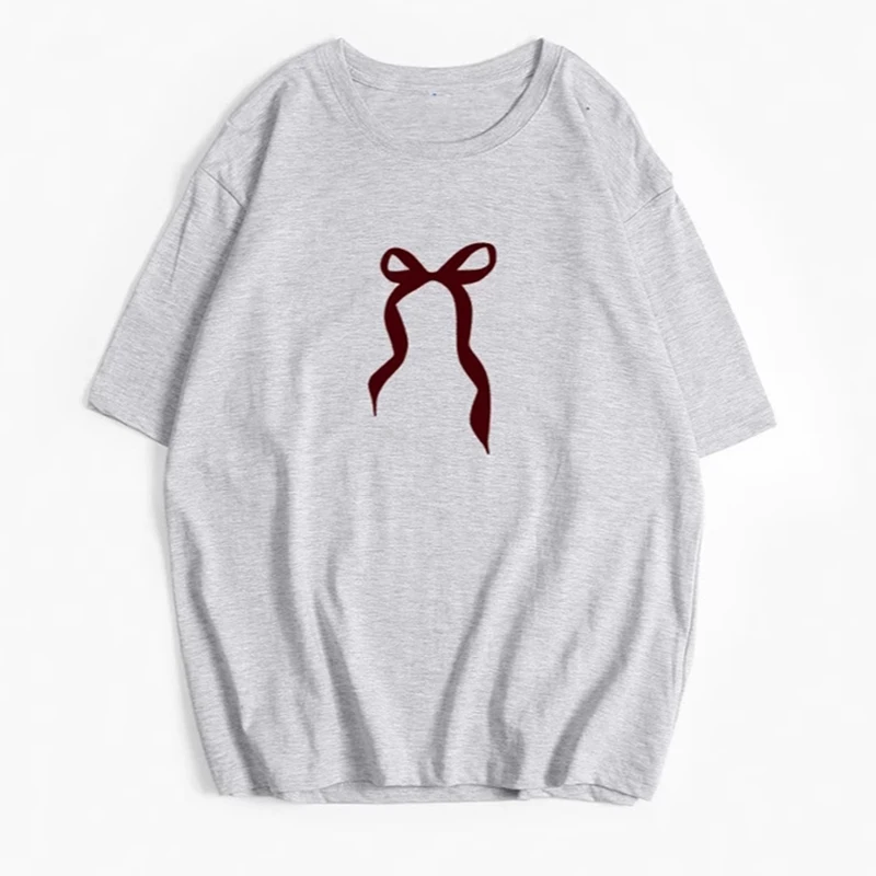 Bow Print Chic White Women T-shirt Cotton New Round Neck Short Sleeve All-match Tee White Casual Streetwear Female Top