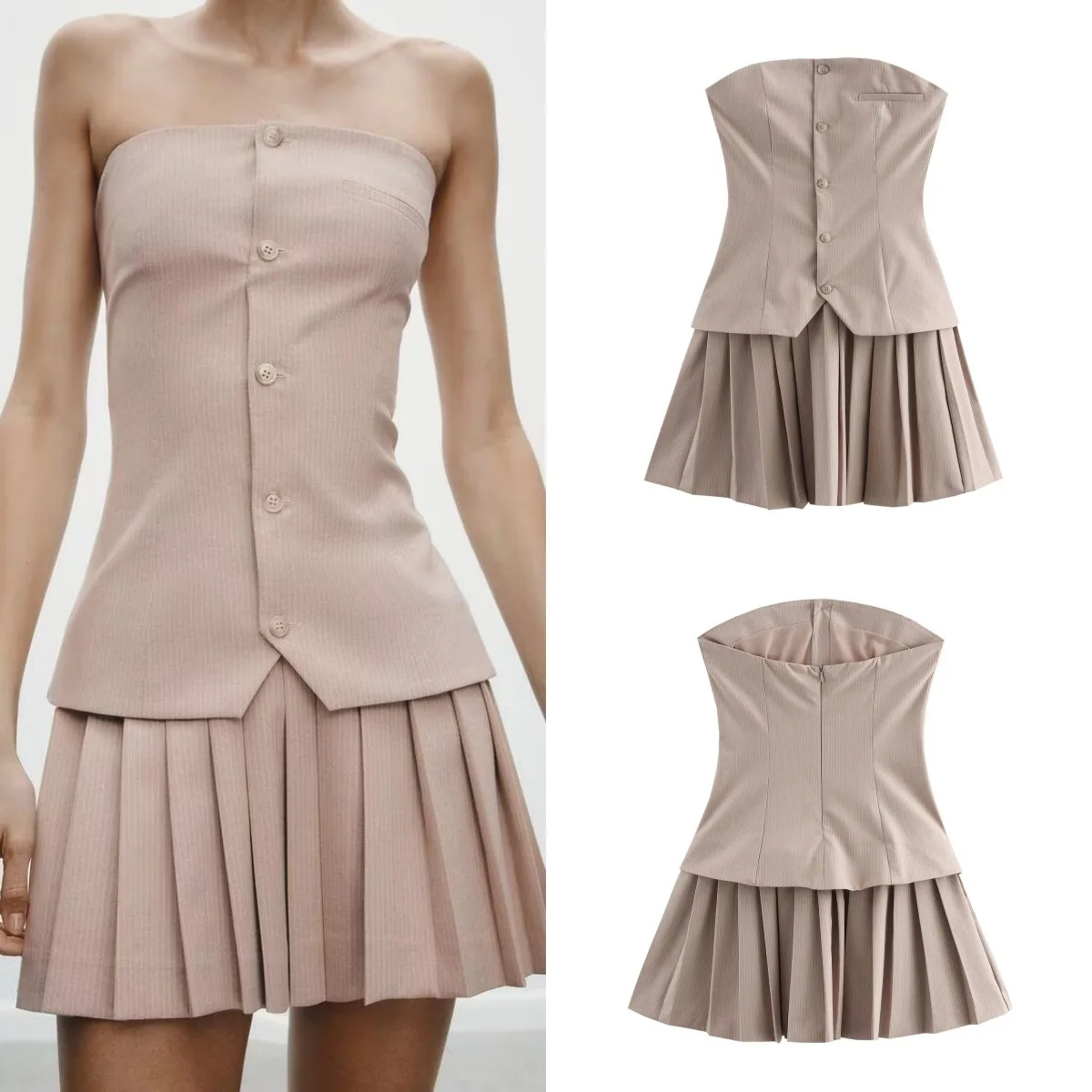 Fake Piece Set Strapless Short Dress 2025 New Fashion A-line Pleat Summer Dress For Women Solid Chic Street Female Clothing