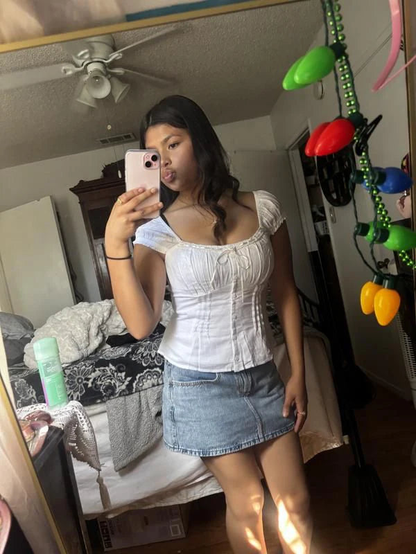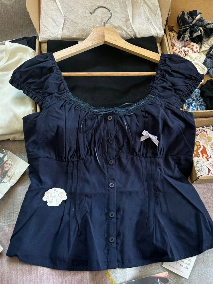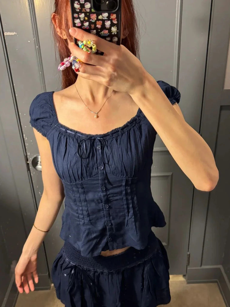 Folds Lace-up T-shirt Blouse Women Summer Lace Trim Square Collar Elastic Waist Short Sleeve Slim Tee Shirt Cotton T-shirt Y2k