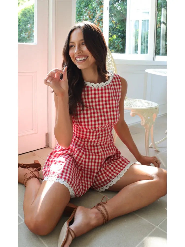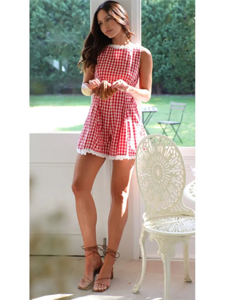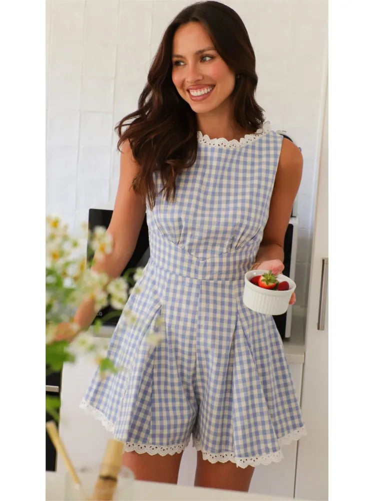 Lace Patchwork Plaid Chic Playsuit 2025 Summer New Round Neck Elastic Waist One Piece Shorts Sleeveless Casual Women Romper