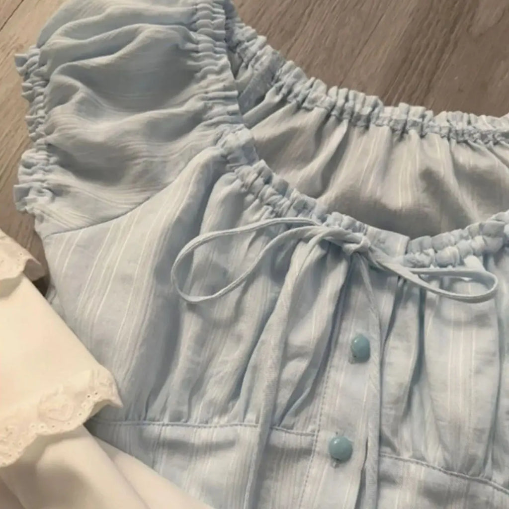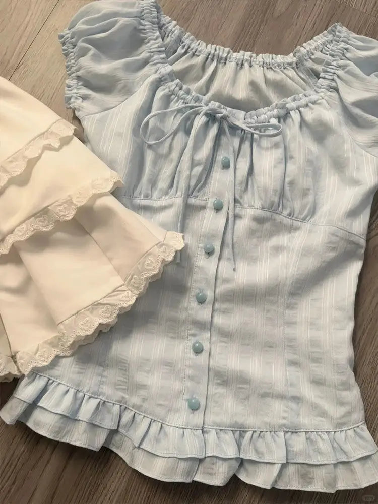 Sweet Fresh French Puff Short-sleeved Ruffled Shirts Women's Summer High-end Waist Slimming Temperament Single Breasted Blouse