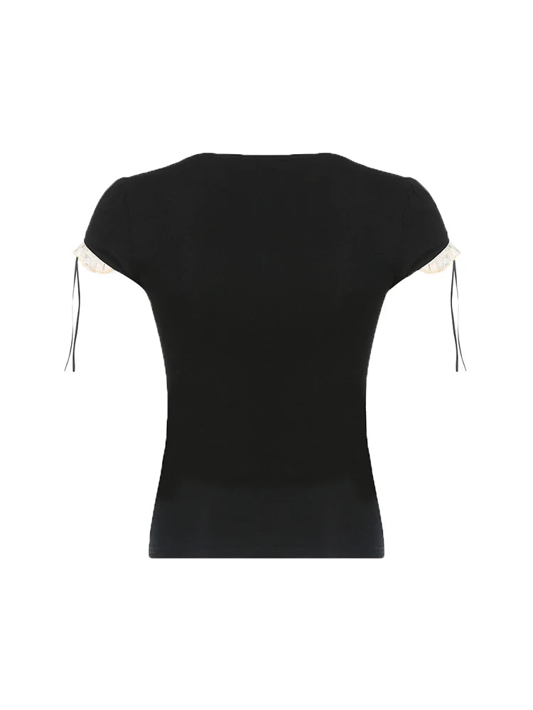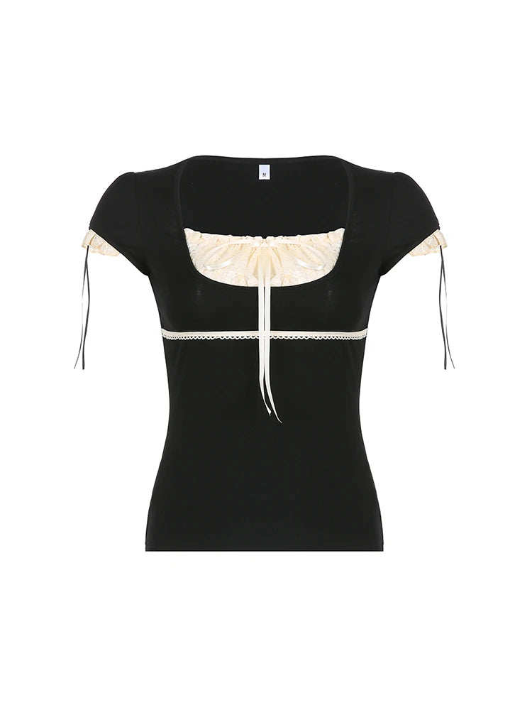 Sweet Y2K Contrast Lace Patchwork Square Collar Black T-Shirt Women Short Sleeve Basic Balletcore Cute Summer Tops