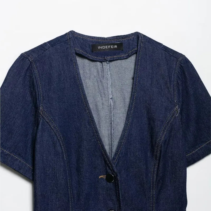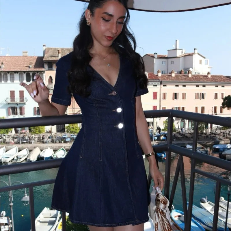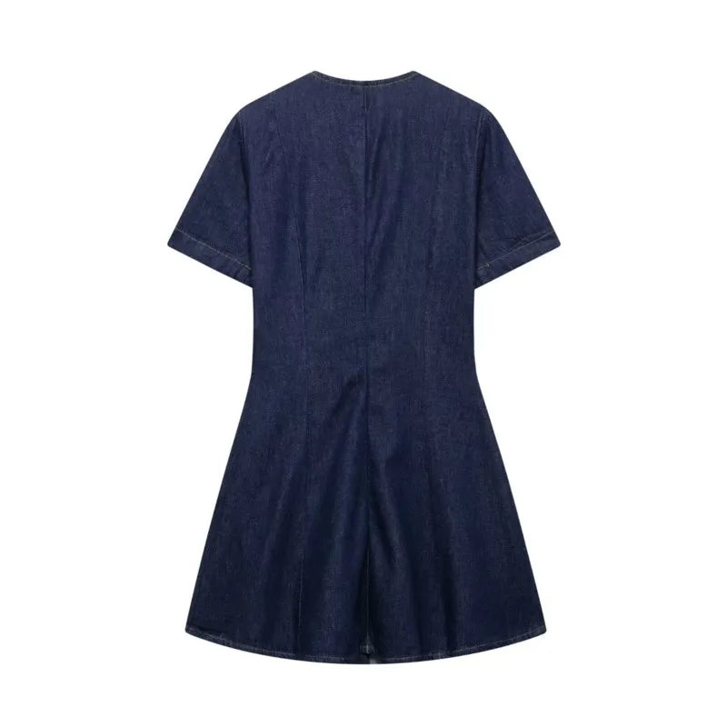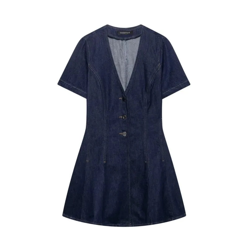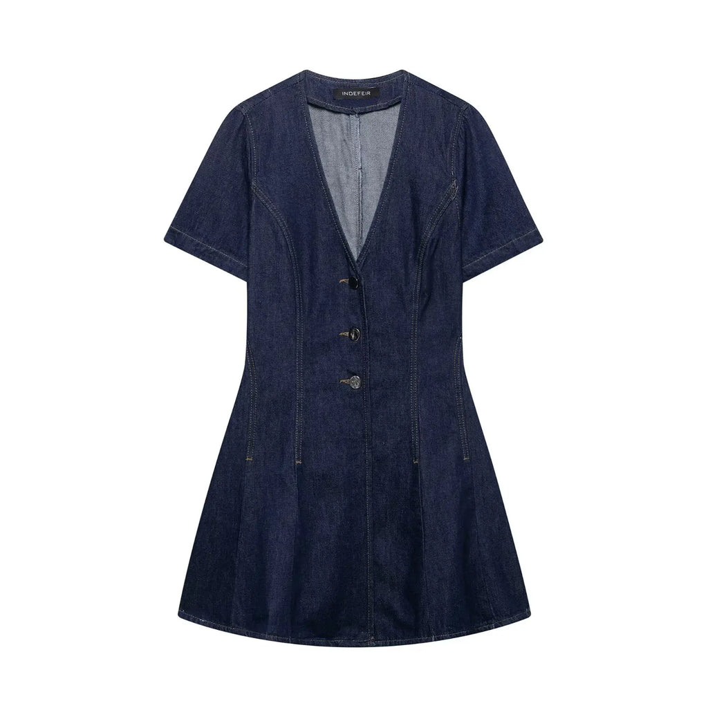 Three Button V Neck Street Chic Demin Dress Women Dress New Short Sleeve A-line Summer Dresss Fashion Retro Woman Clothing