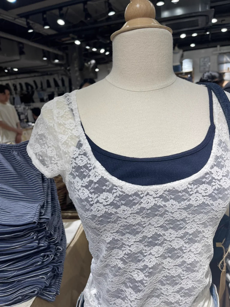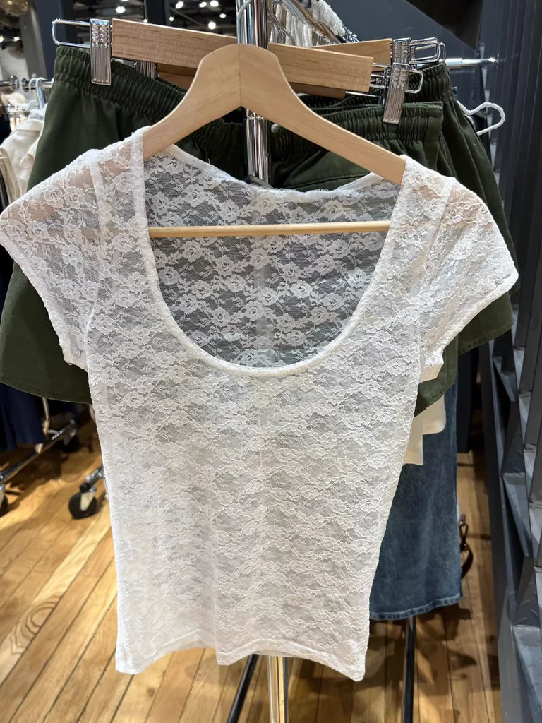 White Lace Sexy Transparent Crop Top Summer Short Sleeve Crew Neck Thin Streetwear T-shirt Women Casual Chic Cute Tees Tops 2023