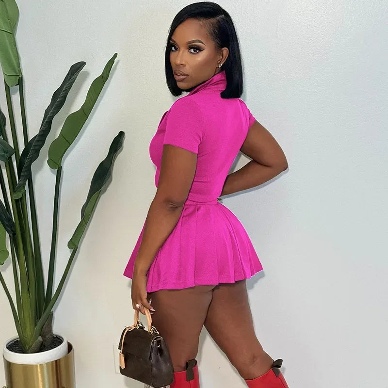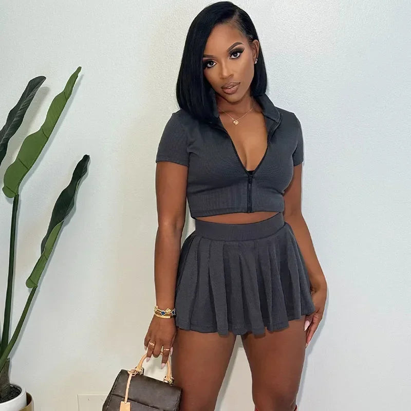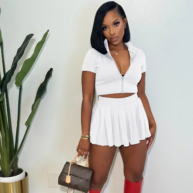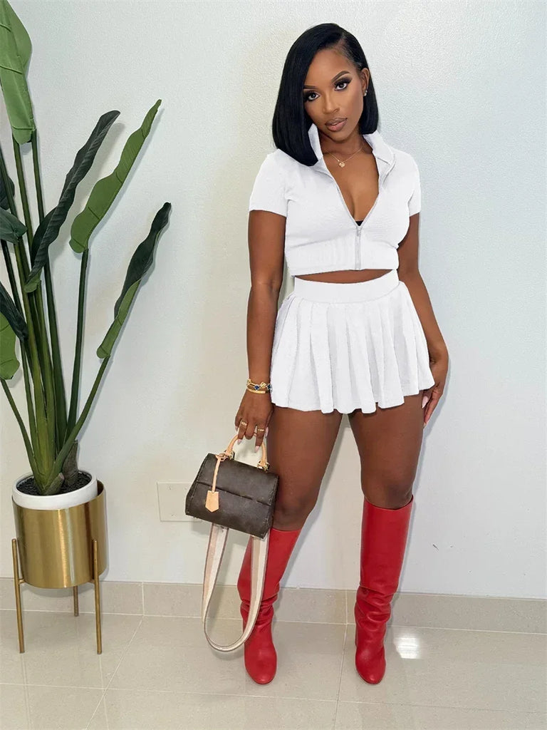 Knitted Pleated A-line Skirt Sets Womens 2 Piece Outfit Zipper Turn-down Collar Crop Top and Mini Skirts New in Matching Sets