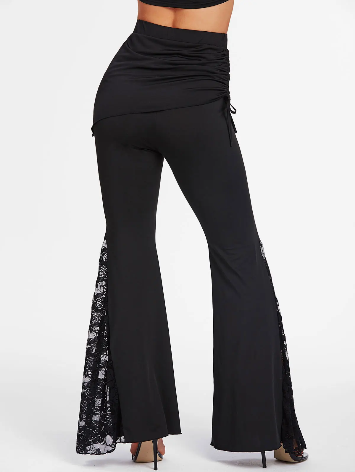 2025 Women's Gothic Black Pants Vintage Flower Lace Insert Skirted Flare Pants Retro Pants