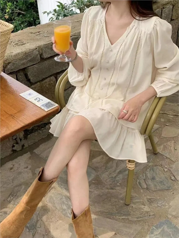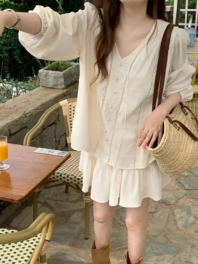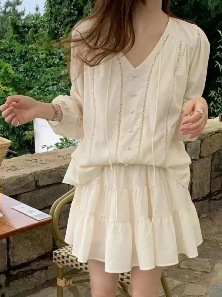 Casual Beige Vacation Spring Summer Outfits Lantern Sleeve Blouse And Short Skirt Two Piece Set 2025 New Top Pleat Skirt Suit
