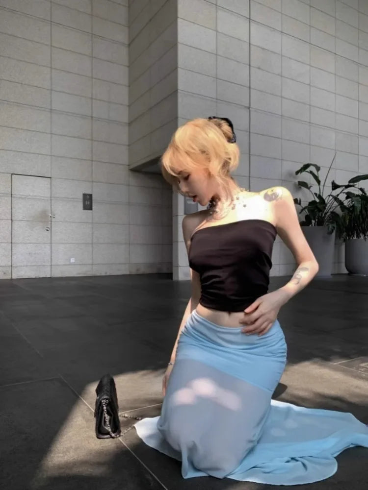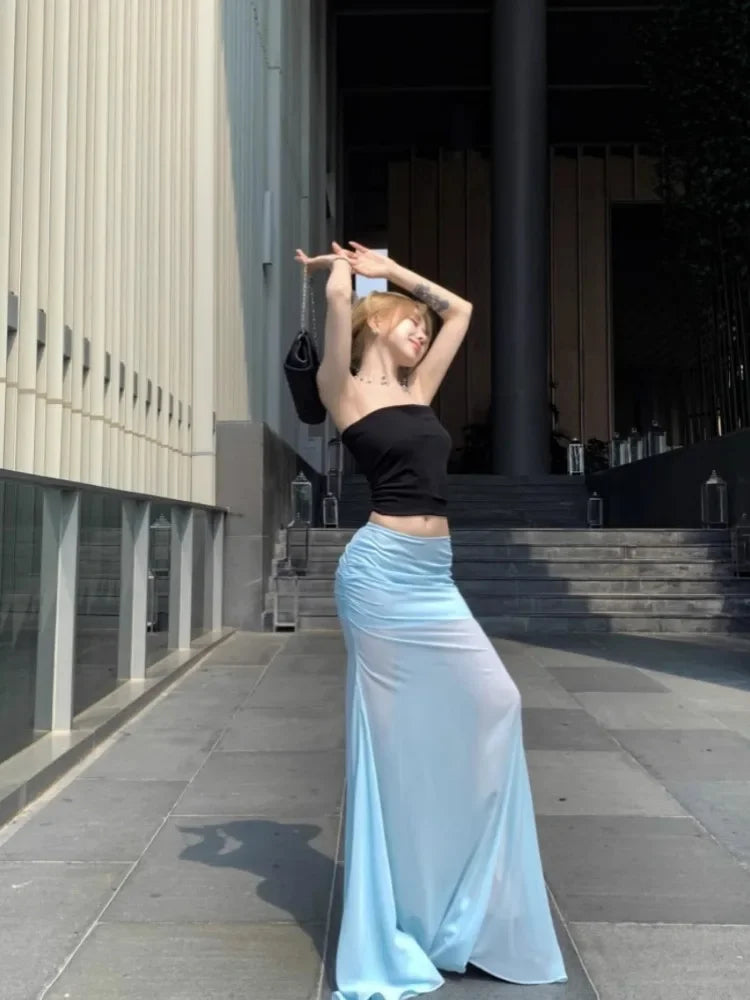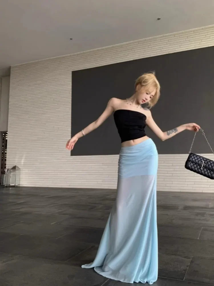 Seaside Gauze Splicing Blue Skirt Female Faldas Para Mujeres Summer Temperament Fishtail Skirt Chic Package Hip Skirts