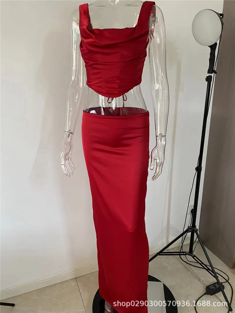Satin Elegant Skirt Two Piece Set Women Sleeveless Backless Crop Tops And Long Skirt Ladies Club Party Sexy Skirt Set