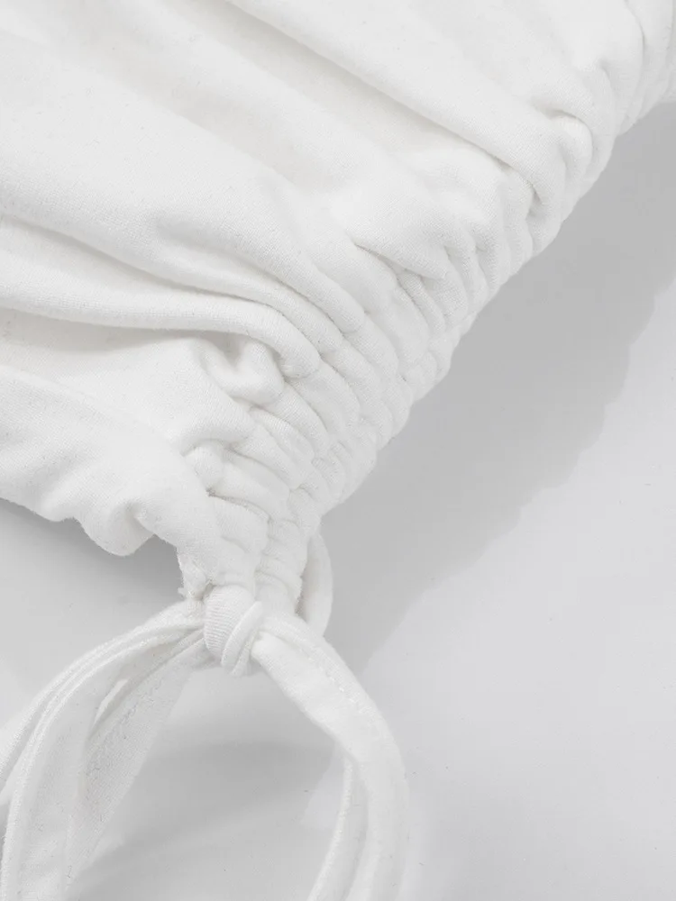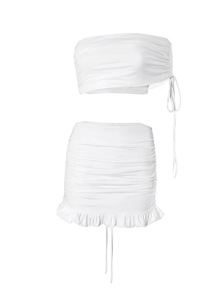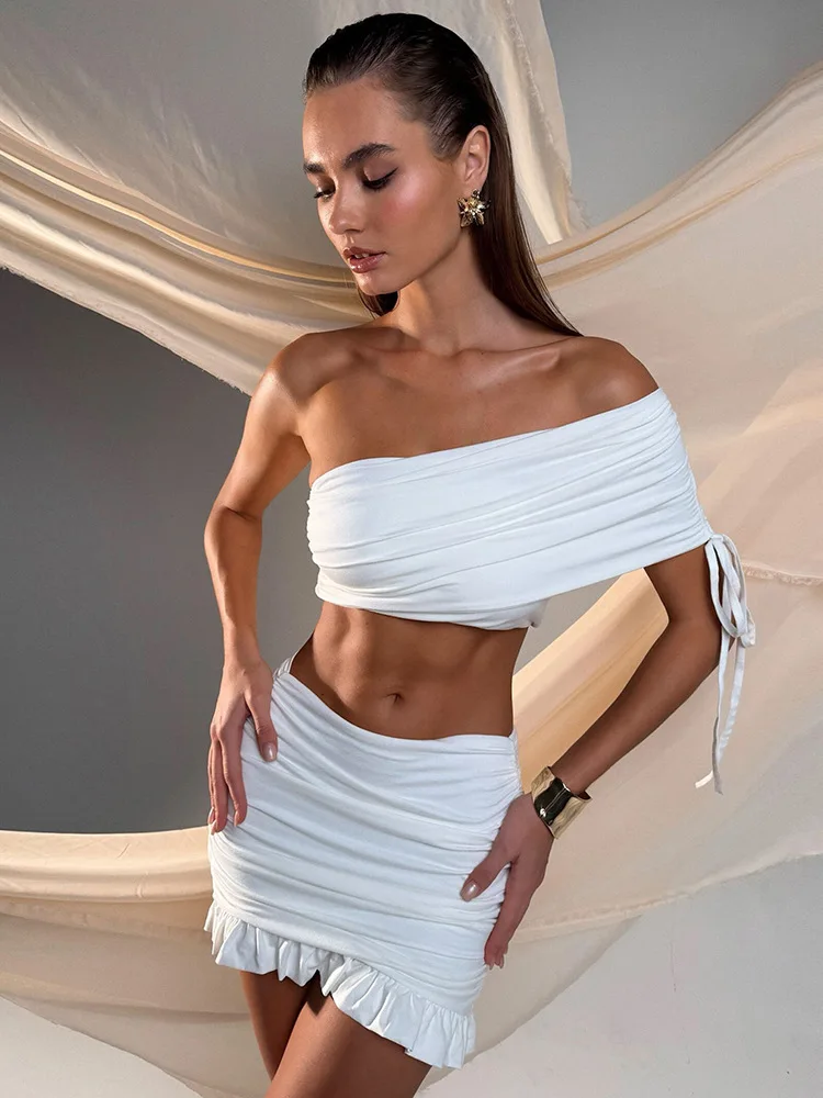 Sexy White Skirt Two Pieces Sets Women Oblique Shoulder Drawstring Crop Tops And Ruffied Skirt Two Pieces Sets Summer
