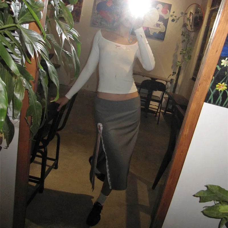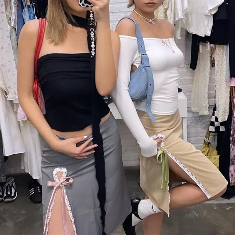 Side Slits Lace Maxi Skirt For Women Kawaii Bow Bandage High Waist Skirts Women's Street Autumn Fashion Sexy Skirt Woman